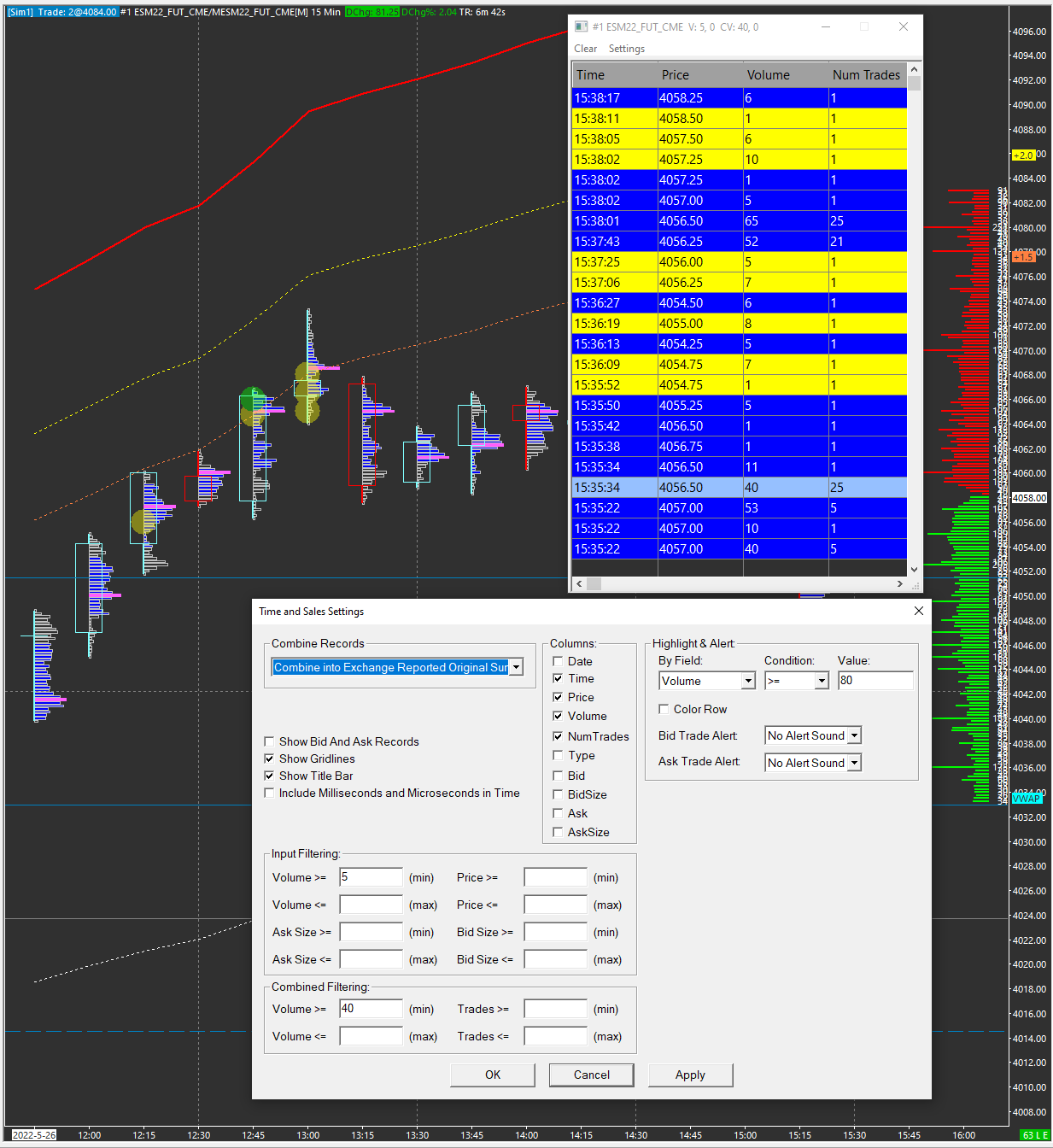 Dear Support - Attached please find the stripped chartbook, and a snip of the T&S settings. As you can see, the filtering is quasi-working... some vol=1 trades are showing randomly (where none should), making this more baffling. It works, randomly. Thanks again. Date Time Of Last Edit: 2022-05-26 19:47:31
