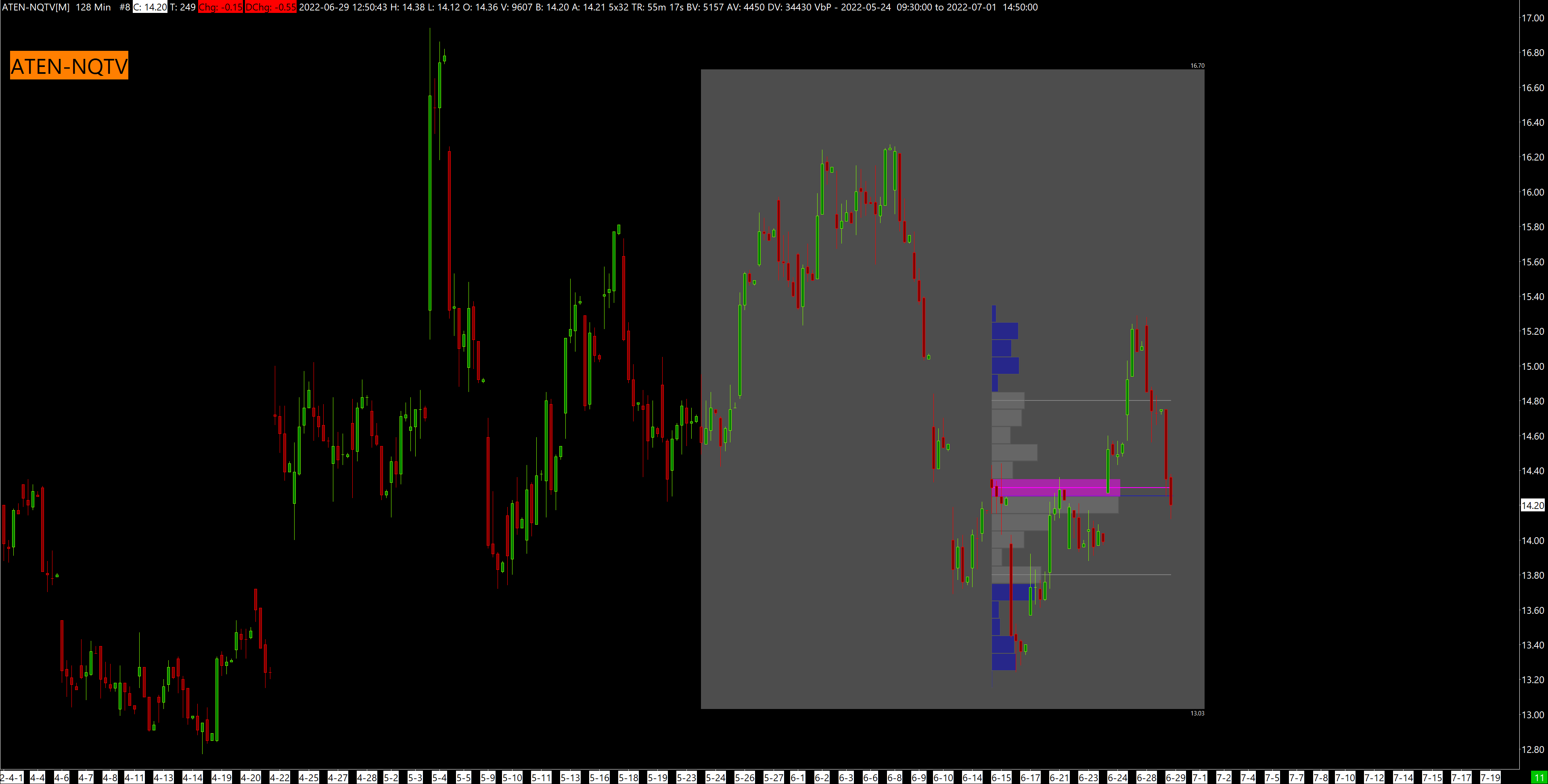 HI Sierra, Help would be appreciated. Please see https://www.sierrachart.com/image.php?Image=1656521502582.png The Shaded Rectangle is the area that I selected for the draw volume profile. As you can see, though, the given draw volume profile is less than half of that area. Whenever I select an area to draw volume profile, I only seem to get a profile for ~the last 50 percent of the region. My guess is that the sierra doesn't recognize the volume for the first half of the profile or something along those lines. All the data is denali. Stocks, futures or whatever. Same issue. Do I need to increase to download more tick data or something like that? Thanks Date Time Of Last Edit: 2022-06-29 16:52:12