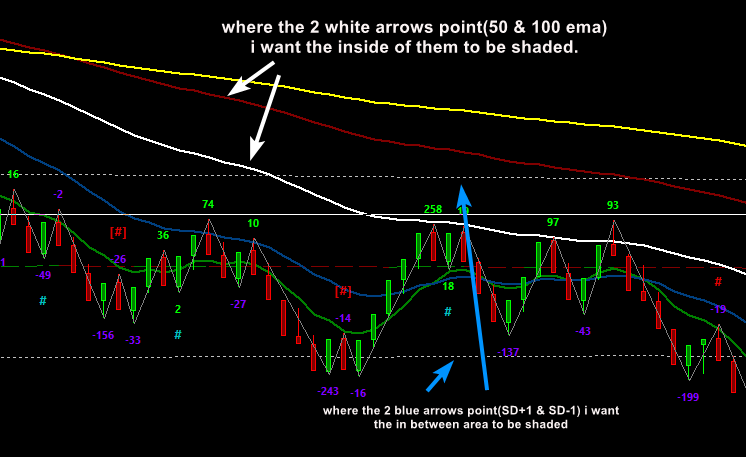 I want the space in betwwen SD+1 & SD-1 to be shaded a color , and a shade area in between 50ema & 100ema