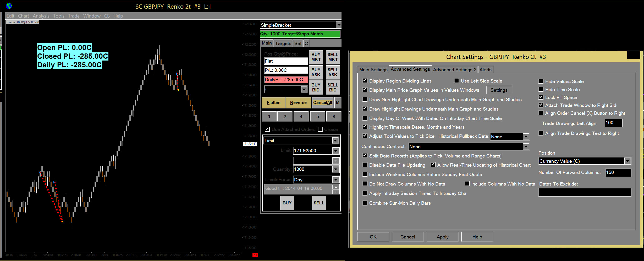 Two image files are attached. One is a screenshot of Sierra showing a GBPJPY chart and Chart Settings, with losing trade entry and exit markers. Note the $285 loss stated in both the Chart Trade window and in the indicator "Trading Profit and Loss Text". The 2nd image is from the FXCM broker account statement for the same trades. Date Time Of Last Edit: 2014-04-17 20:34:30