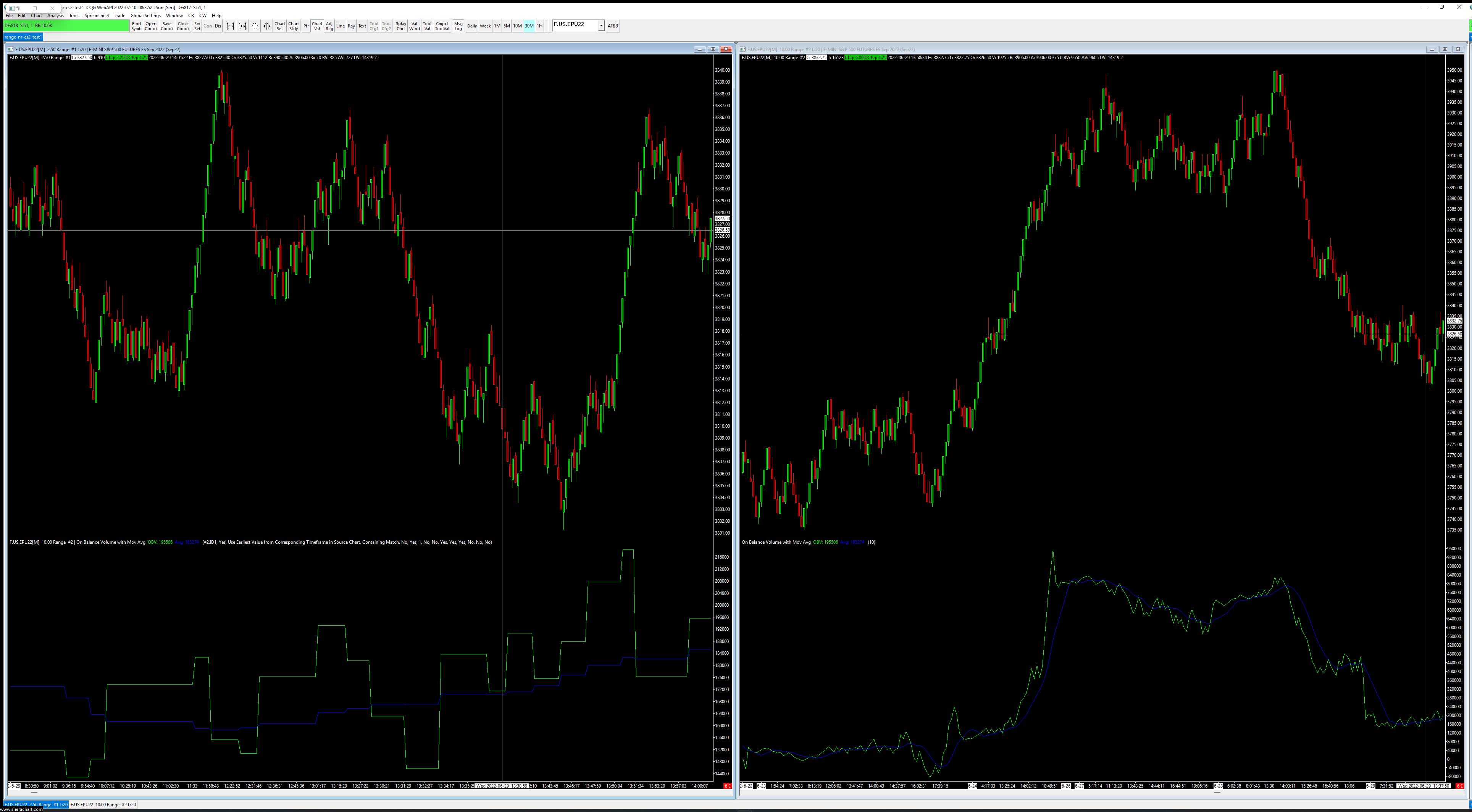 I am overlying OBV indicator with MA line from chrt2 to chart1, when I Replay the chart1 the OBV and the MA line are changing 2-3 bars back. Included 2 screenshots #1 is the replay chart, #2 is the same chartbook in another instance, for example on the Replay chart on 13:51:34 the OBV line is above the MA line, but on the other instance on same chart the OBV line is below MA line. I tested with changing the Data Copy Mode and Bar Time Matching Method, but still same issue. #1. https://www.sierrachart.com/image.php?Image=1657442218285.png #2. https://www.sierrachart.com/image.php?Image=1657442247393.png |