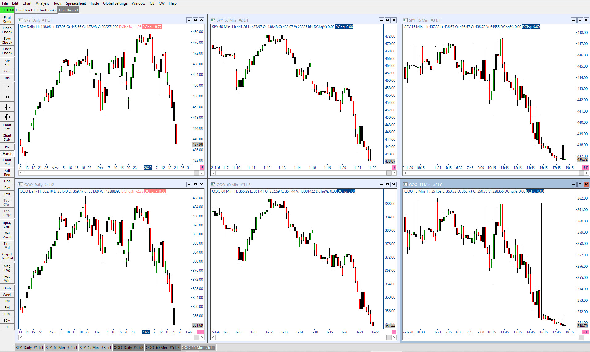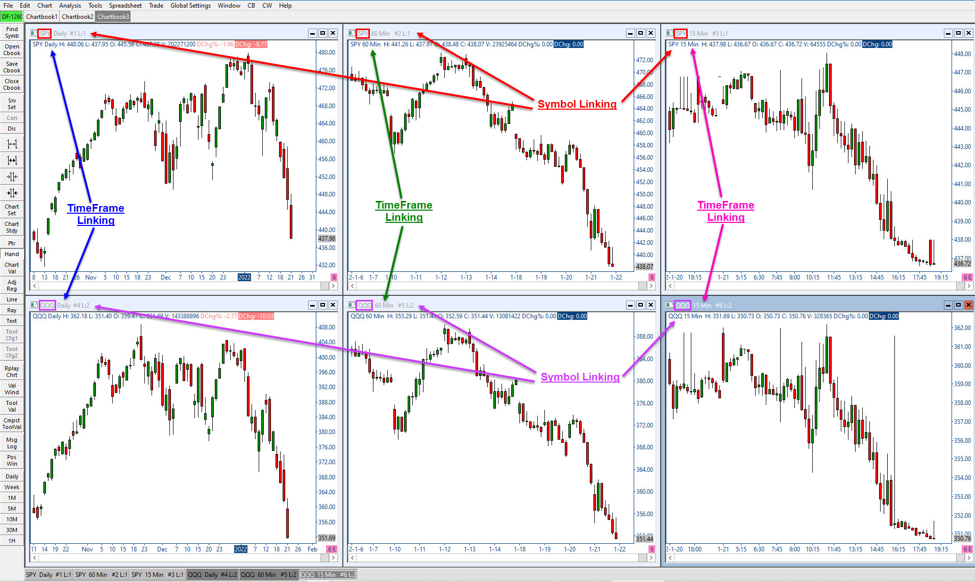 . Have the ability to have two separate individual "Links" per chart. - Symbol & Bar Period - Upper horizontal row of charts linked per a specific Symbol. - SPY - Lower horizontal row of charts linked per a specific Symbol. - QQQ - Each Vertical Chart column linked per a separate Bar Period. - Example: - SPY-Daily-#1 - L1 / L3, - SPY-60-min-#2 - L1 / L4, - SPY-15-min-#3 - L1 / L5 - QQQ-Daily-#4 - L2 / L3, - QQQ-60-min-#5 - L2 / L4, - QQQ-15-min-#6 - L2 / L5 . Date Time Of Last Edit: 2022-07-22 21:57:00