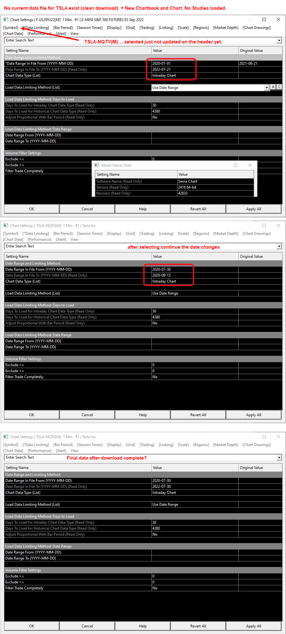Hi John Thank you for the reply. I've now re-run the download on both platforms this time with a new chartbook and single chart, no studies loaded and the .scid file deleted prior to restarting Sierra/downloading. Both platforms, one using an older version and the other with V2416 both give me the same issue. I've attached composite images taken on both platforms which I hope will help. Many thanks. |