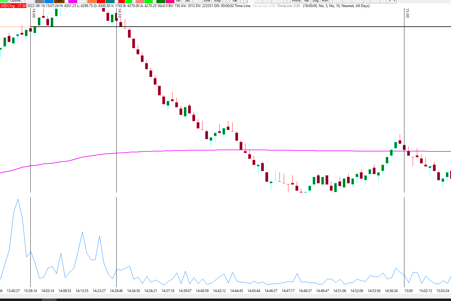 I'm not really seeing what I want on my tick chart. Please see the attached image of my 6 tick S&P chart. I am trying to see an indicator on the bottom of my chart that shows a bigger bar when say 20 ticks have been generated in 30 minutes vs. 10 ticks in 30 minutes. In this case from 14:30 to 15:00 which had very fast price movement compared to the preceding and succeeding 30 minutes.