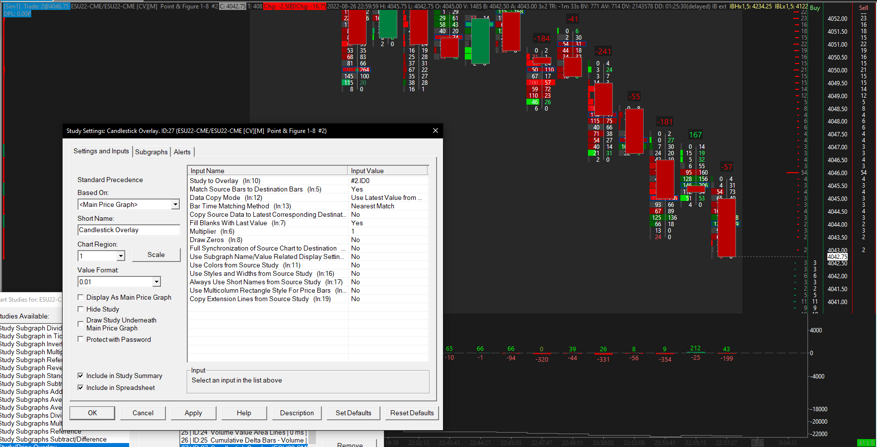 Hello, As shown on the picture, I used a study price overlay to have a candlestick in the middle of the number bars study. I got that. But somehow I don't find how to reduce the size of it. So it doesn't take the space of the number bars study. How can I do this? Thank you |