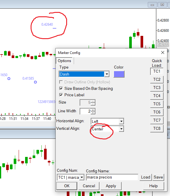 Hi, I'm trying to work with the marker tool. I want to have the config of the attached picture. In As you can see, I placed vertical align: Center. I save the config, I apply it. I do that on Tools -> Tools config. I also tried to do that with the marker tool selected and then tools -> current tool config. On the very moment I try to draw a marker, the program draws it with top vertical align, as the one drawn in the attached file. I don't know what else to do to make the default vertical align center and not top. If I go to a specific marker and I change it to center, there's no problem, but I need to draw it and change the configuration item by item, and I don't have the time to do that while trading live. Is there anything I'm missing? Regards |