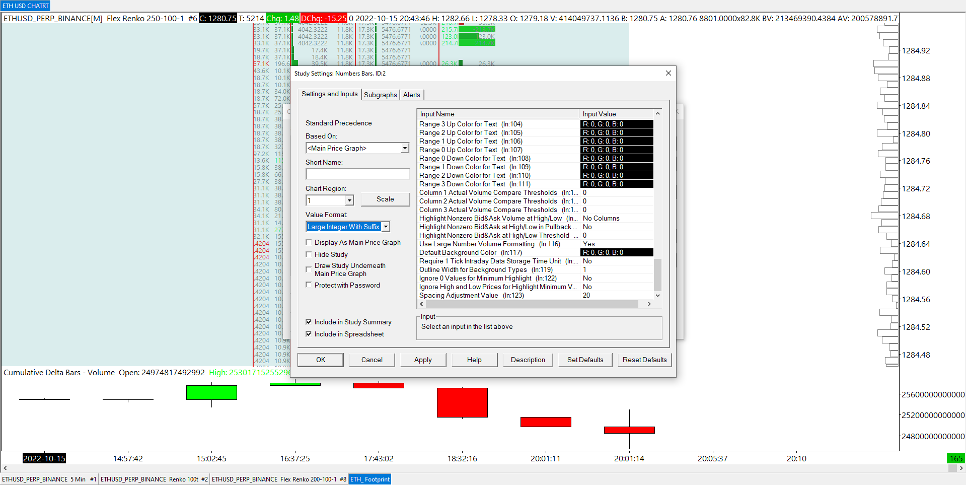 Dear SC Support I have the symbol ETHUSD_PERP_BINANCE being used on the footprint chart. When I use other symbols like Gold and GBPPUSD, I dont get an overload of bid ask, volume data in the candle. I have attached images to explain what I mean. I tried changing the Value Format to 'Large Integer with Suffix' on the number bars study but thats barely done anything. How do I aggregate this data so that it looks simpler and less messy? Otherwise I cannot trade Thank you |