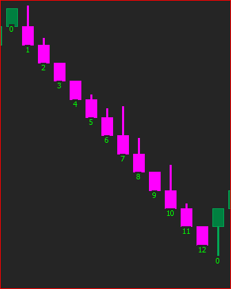 I tried this and it works for me, using this setup: Color Bar Based On Alert Condition study (ID1) with this formula on the Alerts tab: =O>C Spreadsheet Formula study (ID2) with this formula in the Formula field: =IF(ID1.SG1<>0,ID2.SG1[-1]+1,0) Chart Region set to 1 Draw Style set to Value on Low |