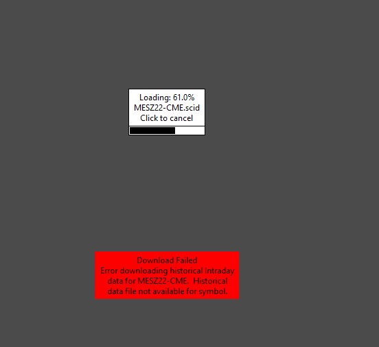 Hi Even I received similar error. "HD Request # 4 | Error downloading historical Intraday data for MESZ22-CME. Historical data logon error: Serving data is disabled | 2022-11-03 09:04:24.847" Charts weren't displaying bars for some time. I closed and opened the chart, but no use. Then after some time, I deleted all data and reloaded; it took some time and finally it worked. Below is the selection of log: SC Data - All Services | Connected to server complete. | 2022-11-03 09:04:24.523 Triggering next historical data download in queue. | 2022-11-03 09:04:24.523 Triggering next historical data download in queue. | 2022-11-03 09:04:24.523 Triggering next historical data download in queue. | 2022-11-03 09:04:24.523 Triggering next historical data download in queue. | 2022-11-03 09:04:24.523 No download requests in the queue to start downloads for. | 2022-11-03 09:04:24.533 No download requests in the queue to start downloads for. | 2022-11-03 09:04:24.533 Mapping MESZ22-CME to MESZ22. Service code: cme | 2022-11-03 09:04:24.549 Using symbol data fast lookup vector | 2022-11-03 09:04:24.549 SC Data - All Services | Starting real-time market data updates for: MESZ22-CME (MESZ22). ID: 1 Service code: cme | 2022-11-03 09:04:24.549 SC Data - All Services | Connecting to the server ds23.sierracharts.com. Port 10048 | 2022-11-03 09:04:24.549 DTC Client socket (5) | Creating socket. | 2022-11-03 09:04:24.549 DTC Client socket (5) | New receive buffer size: 5242880 | 2022-11-03 09:04:24.549 DTC Client socket (5) | Connecting to IP: 142.215.18.103. | 2022-11-03 09:04:24.549 SC Data - All Services | Requesting security definition data for: MESZ22-CME (MESZ22). ID: 1 | 2022-11-03 09:04:24.552 SC Data - All Services | Network connection to server complete. | 2022-11-03 09:04:24.673 SC Data - All Services | Starting socket receive thread. | 2022-11-03 09:04:24.673 SC Data - All Services | Sending encoding request to server: Binary VLS. Compression: standard | 2022-11-03 09:04:24.673 HD Request # 4 | Setting DTC encoding to Binary VLS | 2022-11-03 09:04:24.741 HD Request # 4 | Sending historical data logon request message. | 2022-11-03 09:04:24.741 SC Data - All Services | Setting DTC encoding to Binary VLS | 2022-11-03 09:04:24.787 SC Data - All Services | Sending logon request message. | 2022-11-03 09:04:24.787 Socket (4) | CloseSocket call. | 2022-11-03 09:04:24.847 HD Request # 4 | Error downloading historical Intraday data for MESZ22-CME. Historical data logon error: Serving data is disabled | 2022-11-03 09:04:24.847 Added historical Intraday data request for MESZ22-CME to the queue. | 2022-11-03 09:04:24.847 Intraday data recording state for symbol MESZ22-CME is set to download 'Pending'. | 2022-11-03 09:04:24.847 Socket (4) | Shutdown started. Waiting for graceful close. | 2022-11-03 09:04:24.847 Triggering next historical data download in queue. | 2022-11-03 09:04:24.847 Historical data download thread signaled to stop. | 2022-11-03 09:04:24.847 HD Request # 4 | Received 0 Intraday data records from 00:00:00.000000 to 00:00:00.000000 (0.0 seconds) and wrote 0 records for MESZ22-CME | 2022-11-03 09:04:24.847 HD Request # 4 | Completion time: 0s. | 2022-11-03 09:04:24.868 Delaying start of download for MESZ22-CME. | 2022-11-03 09:04:24.872 HD Request # 3 | Requesting historical Daily data for ETM15 starting at 2014-10-01. SC External HD service. | 2022-11-03 09:04:24.874 SC Data - All Services | Received logon response. | 2022-11-03 09:04:24.894 SC Data - All Services | Server Name: RealTime Server. | 2022-11-03 09:04:24.894 SC Data - All Services | Server protocol version: 8. Client protocol version: 8 | 2022-11-03 09:04:24.894 SC Data - All Services | Logon error received from server: Data service (sc_exchange2.datafeed) is disabled or unsupported. A software update may be necessary. | 2022-11-03 09:04:24.894 SC Data - All Services | Waiting for socket receive thread to end | 2022-11-03 09:04:24.894 DTC Client socket (5) | CloseSocket call. | 2022-11-03 09:04:24.895 DTC Client socket (5) | Shutdown started. Waiting for graceful close. | 2022-11-03 09:04:24.895 SC Data - All Services | Disconnected from the server. | 2022-11-03 09:04:24.895 SC Data - All Services | Data feed disconnected. Will reconnect in 2 seconds. | 2022-11-03 09:04:24.895 Socket (4) | Socket gracefully closed by remote side. | 2022-11-03 09:04:24.952 Socket (4) | Closed. | 2022-11-03 09:04:24.953 DTC Client socket (5) | Socket gracefully closed by remote side. | 2022-11-03 09:04:25.013 DTC Client socket (5) | Closed. | 2022-11-03 09:04:25.013 HD Request # 3 | Receiving historical Daily data for MESM15-CME starting at 2014-10-02. | 2022-11-03 09:04:25.150 HD Request # 3 | Writing historical Daily data to the file MESM15-CME.dly. | 2022-11-03 09:04:25.150 HD Request # 3 | Bytes received: 196 | 2022-11-03 09:04:25.150 HD Request # 3 | Received 4 Daily data records from 2014-10-02 00:00:00 to 2014-10-06 00:00:00 (5.0 days) and wrote 3 records for MESM15-CME | 2022-11-03 09:04:25.150 HD Request # 3 | Completion time: 2s. | 2022-11-03 09:04:25.150 HD Request # 3 | Daily data download complete for MESM15-CME. Unique request ID: 3 | 2022-11-03 09:04:25.150 Removing historical data download ID 3. | 2022-11-03 09:04:25.150 Date Time Of Last Edit: 2022-11-03 16:00:10