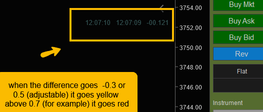 Hi, I just moved back to Seirra from Ninja where I was using an indicator to monitor data delay in 1/100 of a sec and changes color at defined threshold from green to yellow and Red. which is quite useful before placing a trade. The output can be placed anywhere in the chart like time remaining study of Sierra. In Sierra the delay comes at Top which is difficult to monitor (not eye catching) and doesn't provide much precision especially in the fast-moving markets. Is the Sierra technical team can make a simple study to mimic the Ninja's indicator. I have attached picture that are self-explanatory. Thanks |