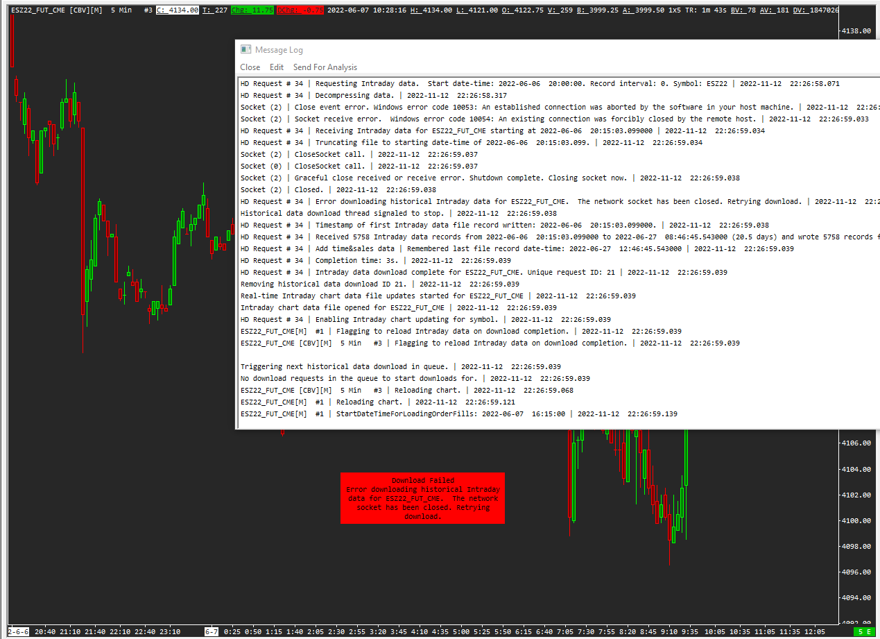 Hi, I am successfully able to create a Historical Daily chart for the ESZ2022 CME Futures contract, however when I try to do the same for intraday data I receive the attached error. Message log also sent and pasted below FYI. Reading Internal Order ID file. | 2022-11-12 22:18:56.771