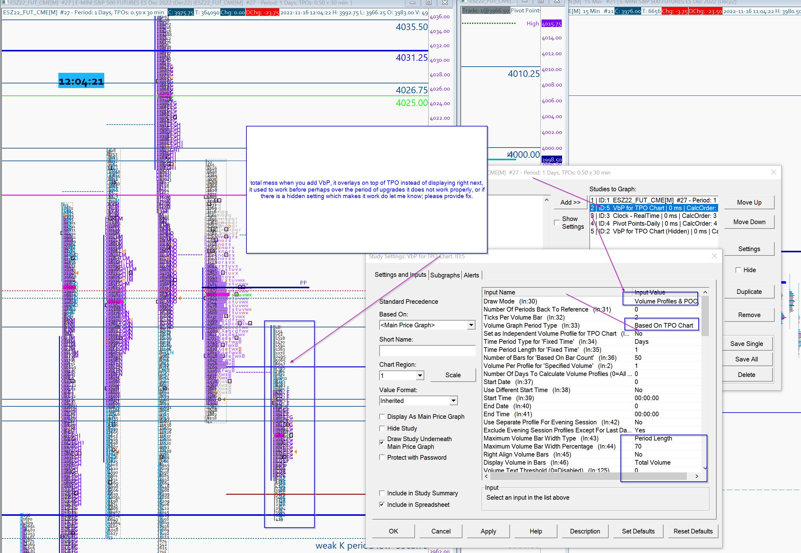 1) Study - Vbp: While adding Volume by price next to TPO profile either it overrides or its not useful, in the past it used to provide an option to display right next to TPO profile, however after the upgrade this setting no longer works, Please review and address. 2) Total mess when you add VbP, it overlays on top of TPO instead of displaying right next, it used to work before perhaps over the period of upgrades it does not work properly, or if there is a hidden setting which makes it work do let me know; please provide fix. Please refer screen shots with add on mix. |