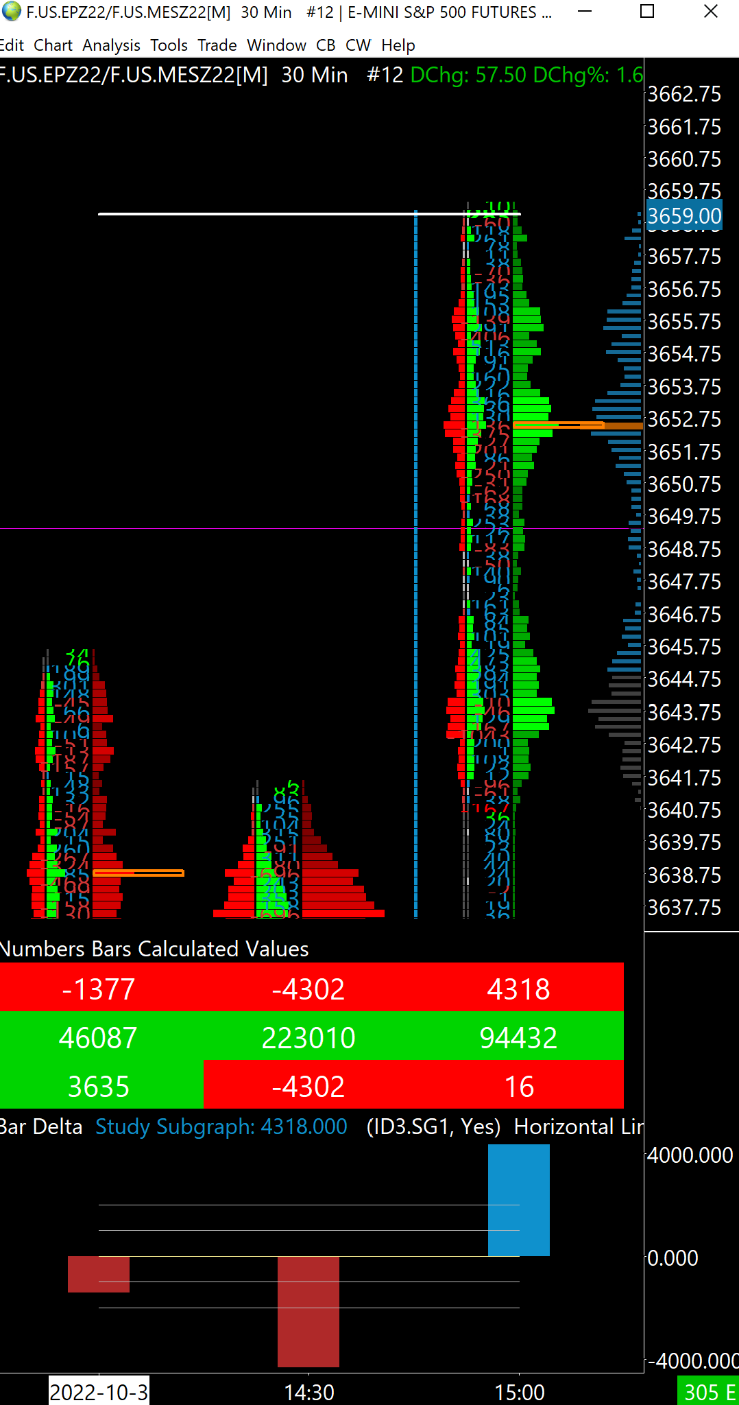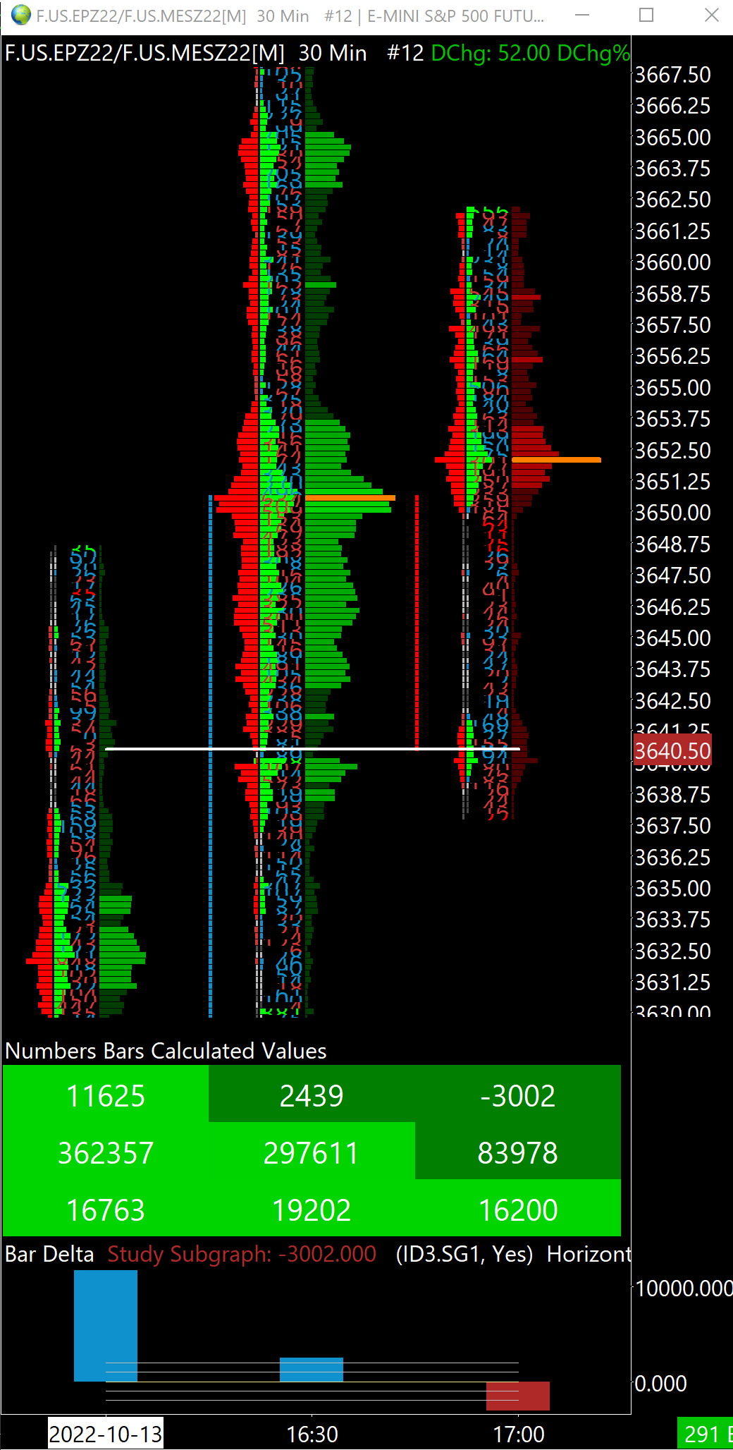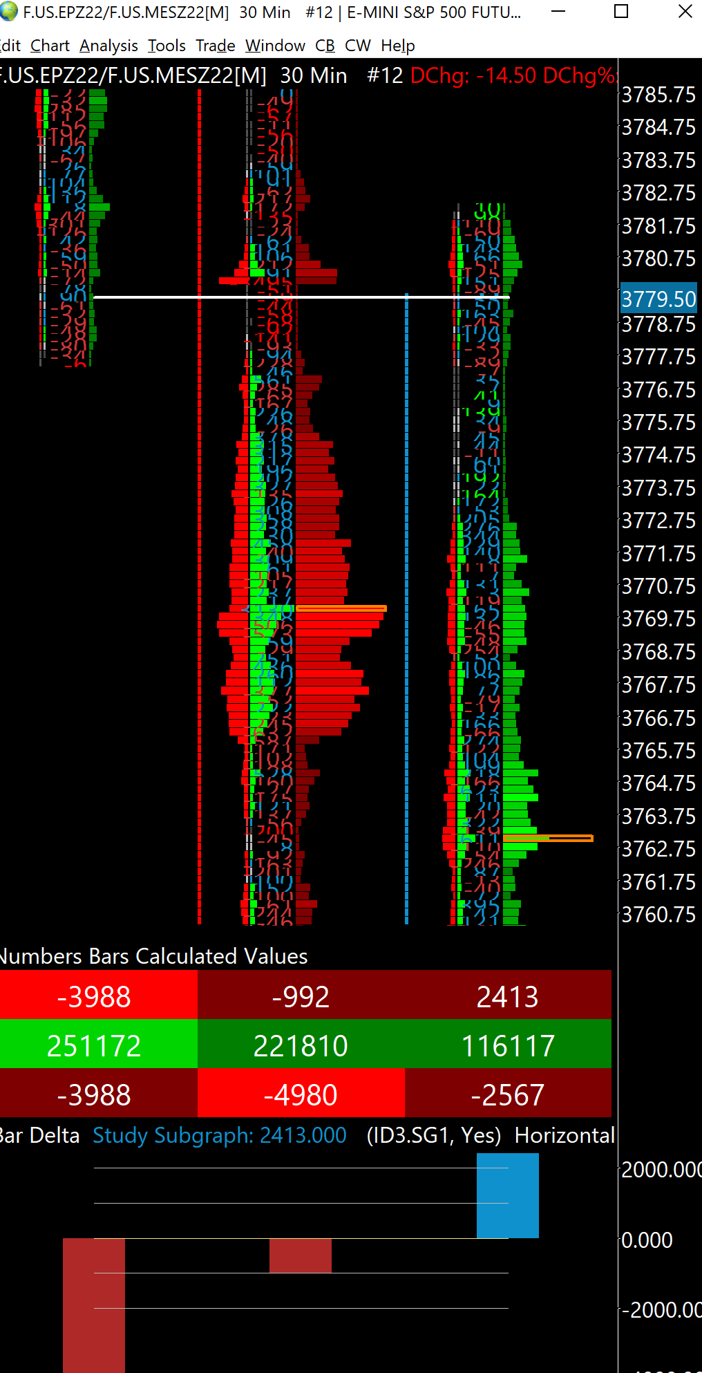 The background colour of the current Numbers Bars Calculated Values "Ask Volume Bid Volume Difference" sometimes displays the wrong background colour while the bar is in progress. For example: The value is negative, but the background colour has a positive colour. The value is positive, but the background colour has a negative colour. After the bar closes, the background colour is correct. This isn't happening all of the time, but does happen quite frequently - I haven't looked closely enough to find out what the condition is that causes it. Two dates with ESZ22 30M Numbers Bars to see this: 2022-10-03 10:00 EST - positive value, negative background 2022-10-13 12:00 EST - negative value, positive background I just noticed that the Day Delta value on the 2022-10-03 example is also positive with a negative background, so I guess all subgraphs would be affected by this under the right condition. |