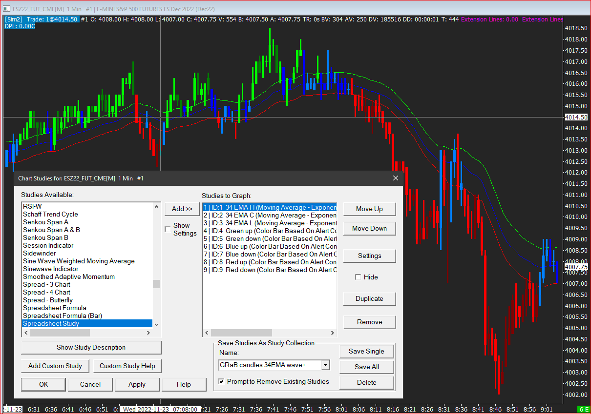 If you click on GRaB candles 34EMA wave+ in the Analysis menu, and click Yes when asked 'Clear existing studies on chart, it will load 9 studies. See attached pic. There are no parameters to set, except the colors, and the EMA lengths. |