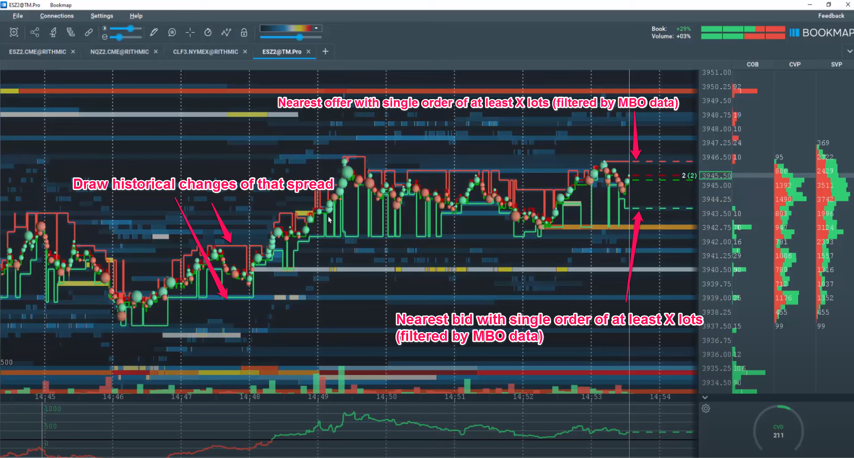 Hi, I'd like to replicate a feature visible on the attached screenshot It's very simple, light red and light green lines are the nearest bids/offers that have at least one single order of quantity greater or equal to some predefined minimum number of lots to display. Ie it displays nearest price levels that have at least one order with quantity greater than 20 lots. That's a bit different to 20 separate one lot orders I'd like to see current spread and to draw historical changes of that spread I know Sierra is the most powerful platform and for sure it can be done, but I have no clue how to configure this. Can you please assist me? |