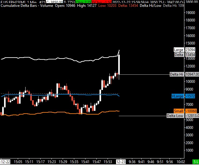 Currenlty i have a chart for cummulative delta bars with a chart filter setting of exclude =>10 then I have a cummulative delata chart with chart filter exclude>=100 exclude<=9, and I have a chart for cummulative delta bars with exclude<=99...I use these inidividual charts to reference small, large, and very large delta that are being traded.... I then hav a chart that i combine all of these chaerts on via study overlay for each as well as an cummulative delat bars (not filtered) on a chart...I use this to see the cummulative delta and what the size players are doing... my question is there a way to streamline this all into one chart? Please see example JPGs attached |