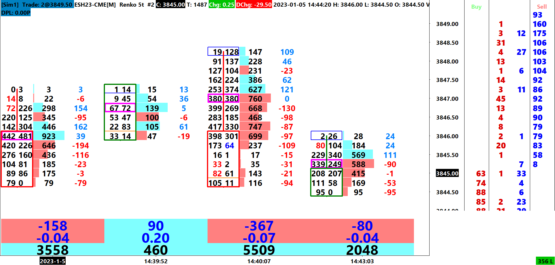 Hi John, Okay understand cannot overlay Number bars to a trading DOM. I've attached a DOM to the footprint see image 1 and would like the DOM on the right side to look like the DOM I have configured image 2, but I think because image 1 has the footprint too then I cannot get the same DOM like in image 2? I have tried to change the Chart DOM settings to Trade DOM settings in Graphics settings. If I cannot achieve this is there a way I can use the Current Traded Bid Volume & Current Traded Ask Volume in Hidden Columns (Customise Chart/Trade DOM Columns) to refresh after price moves away and back a certain number ticks, rather than accumulating volume? Kind Regards Stephen |