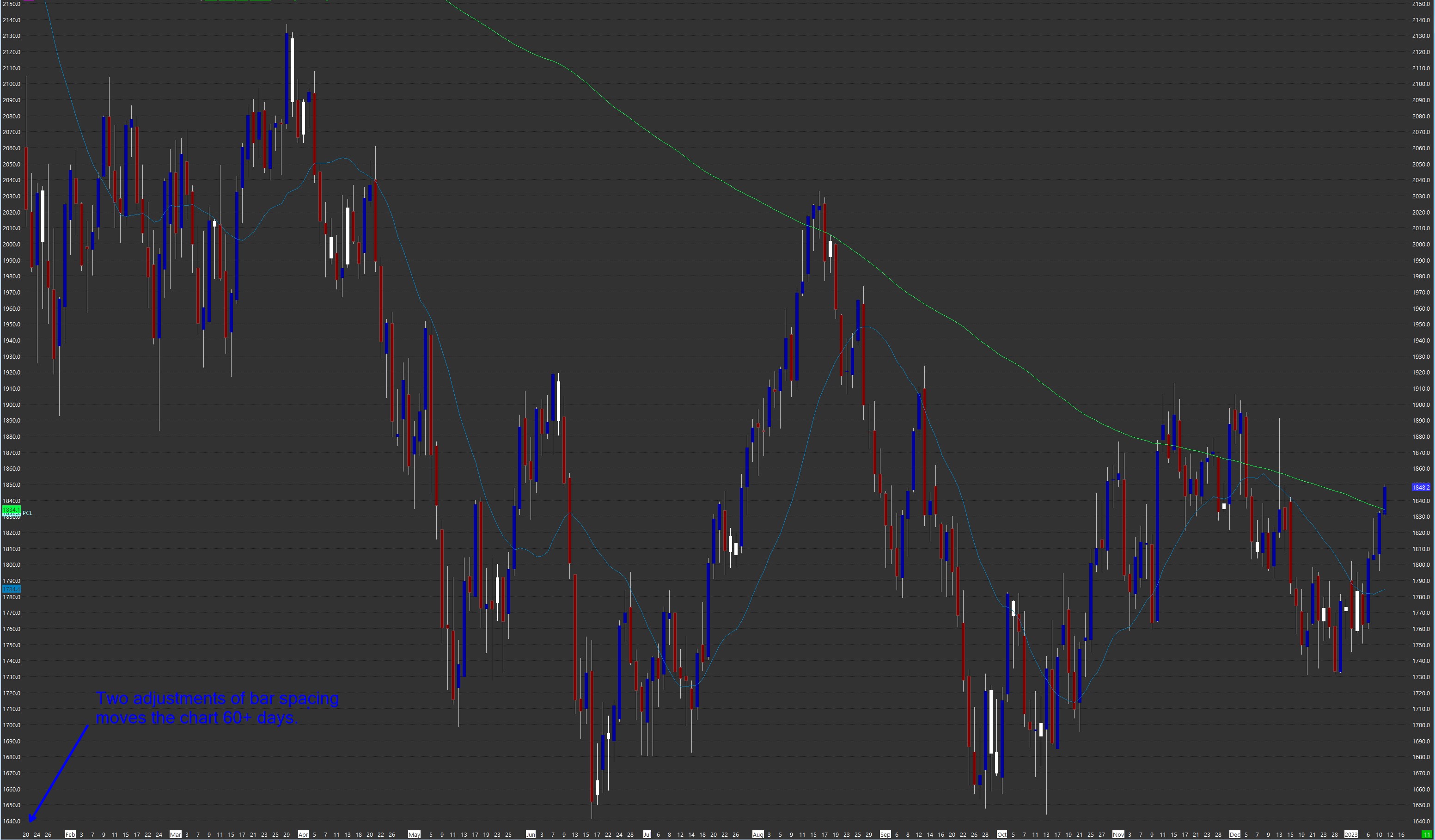 See attached. Also included 2 charts. If I scroll to the right and fill in the chart 'dead space', then adjust bar spacing (to get to my desired time frame) by 2 adjustments, chart shifts 60+ days.