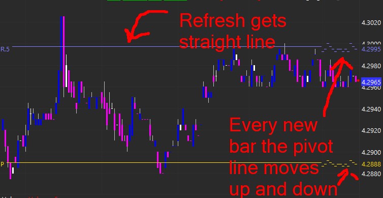 I have spent an ungodly amount of time trying to figure out this out and finally got it. I thought it was related to a chart setting or the pivot point study but found out that if changed the Global Symbol Setting --> Start New Daily Baily At Start Time FROM No to YES the pivot lines stopped updating on every new candle print. Any ideas why this setting causes this? The jagged lines in the Pivot would stay like that for days unless I refreshed the chart data. See attached images. |