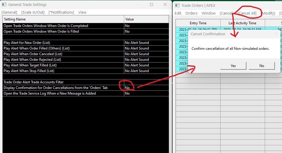 Regarding Canceling All Orders... 4.Press the Cancel All button on the Trade Orders window to cancel the open/working orders. 5. You will receive a confirmation window. Press Yes to confirm. This confirmation window can be disabled with Global Settings >> General Trade Settings >> Display Confirmation for Order Cancellations through the Trade Orders Window. Trading Information Windows: Canceling All Orders Still get the pop up confirmation window when disabled (see attached image) Date Time Of Last Edit: 2023-02-04 21:39:36