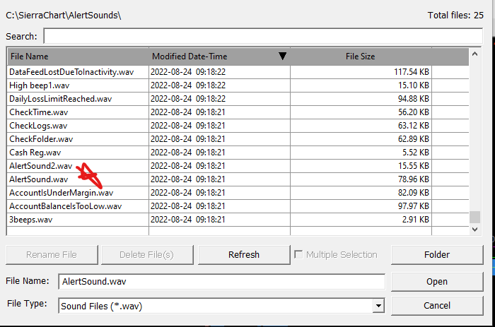 Thanks, The alert sounds don't work. I have alerts for certain conditions when they happen... how do I add them? Please see attached screenshot. I want a sound to happen when that condition is met. I tried Alert 2 & Alert 1, and no sound is made. Sometimes it happens, but then other times it does now. Any help on how to make this consistent? When this study setting occurs... I want a sound to play. But no sounds are played. And there are 200 alerts in the drop down menu... but only 2 alert sound wav files (see 2nd screenshot). Where are the rest?