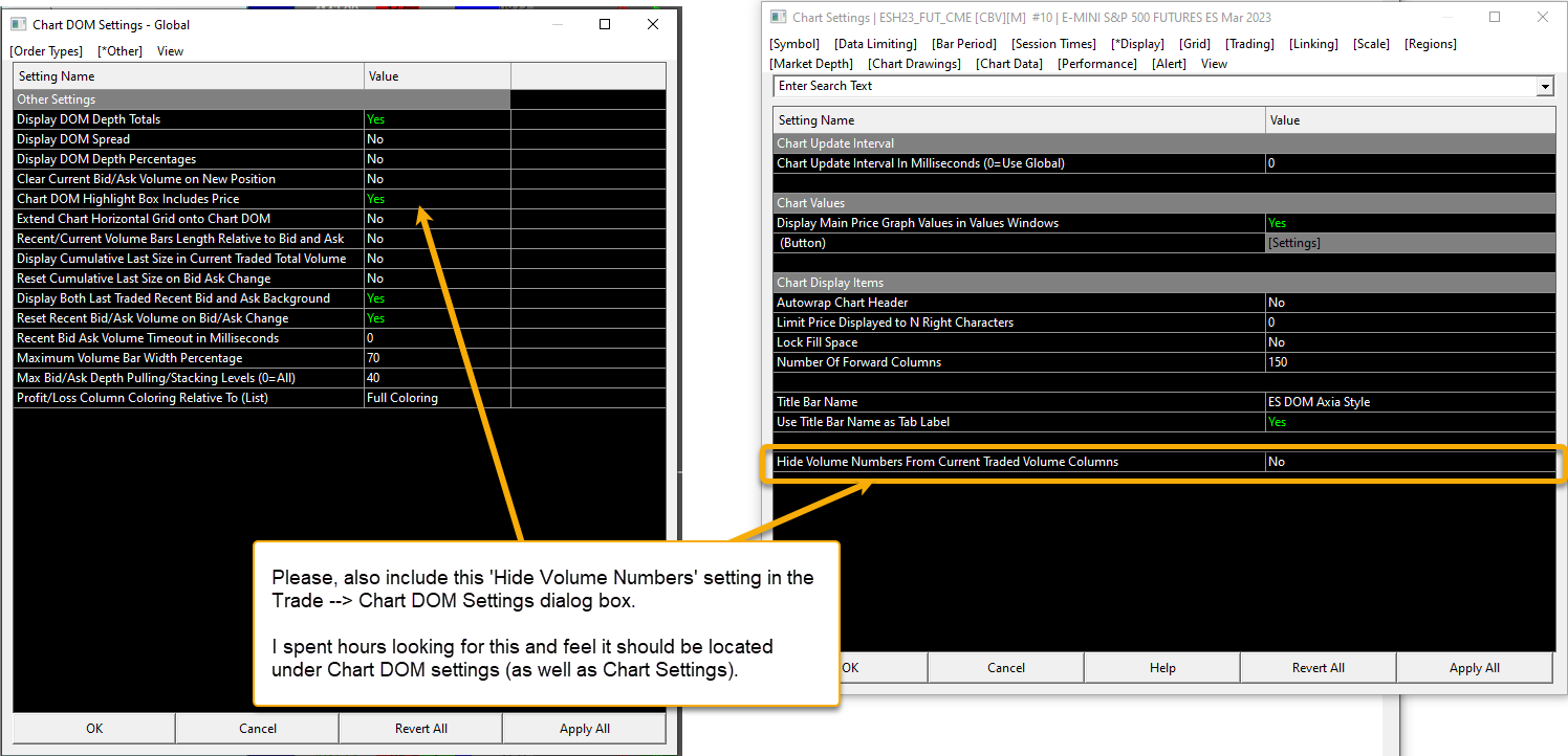 I spent over 1 hour looking for the button that will "Hide Volume Numbers From Current Traded Volume Columns". Searches kept bringing me to threads that installed the Volume by Price indicator and I couldn't remember the exact wording of the setting so, my guesses on the wording were not resulting in finding this in the Sierra platform. Anyway. I would love to see this change. The enclosed image explains everything. The Hide Volume Numbers setting should also be located in the Trade Tab under Chart DOM settings. Thank you so much for considering this change. |