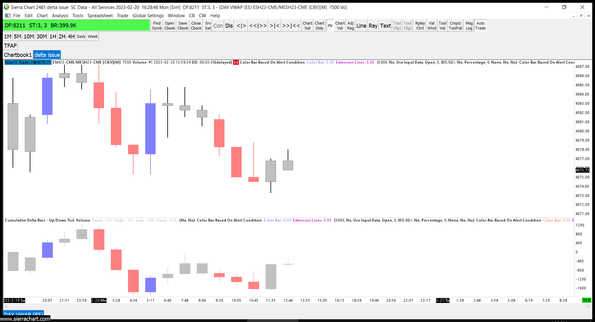 We do not see any issue at all with your chart and the Color Bar Based on Alert Condition studies. When we open it we see the following: https://www.sierrachart.com/image.php?Image=1676932127887.png For the most reliable, advanced, and zero cost futures order routing, use the Teton service: Sierra Chart Teton Futures Order Routing |