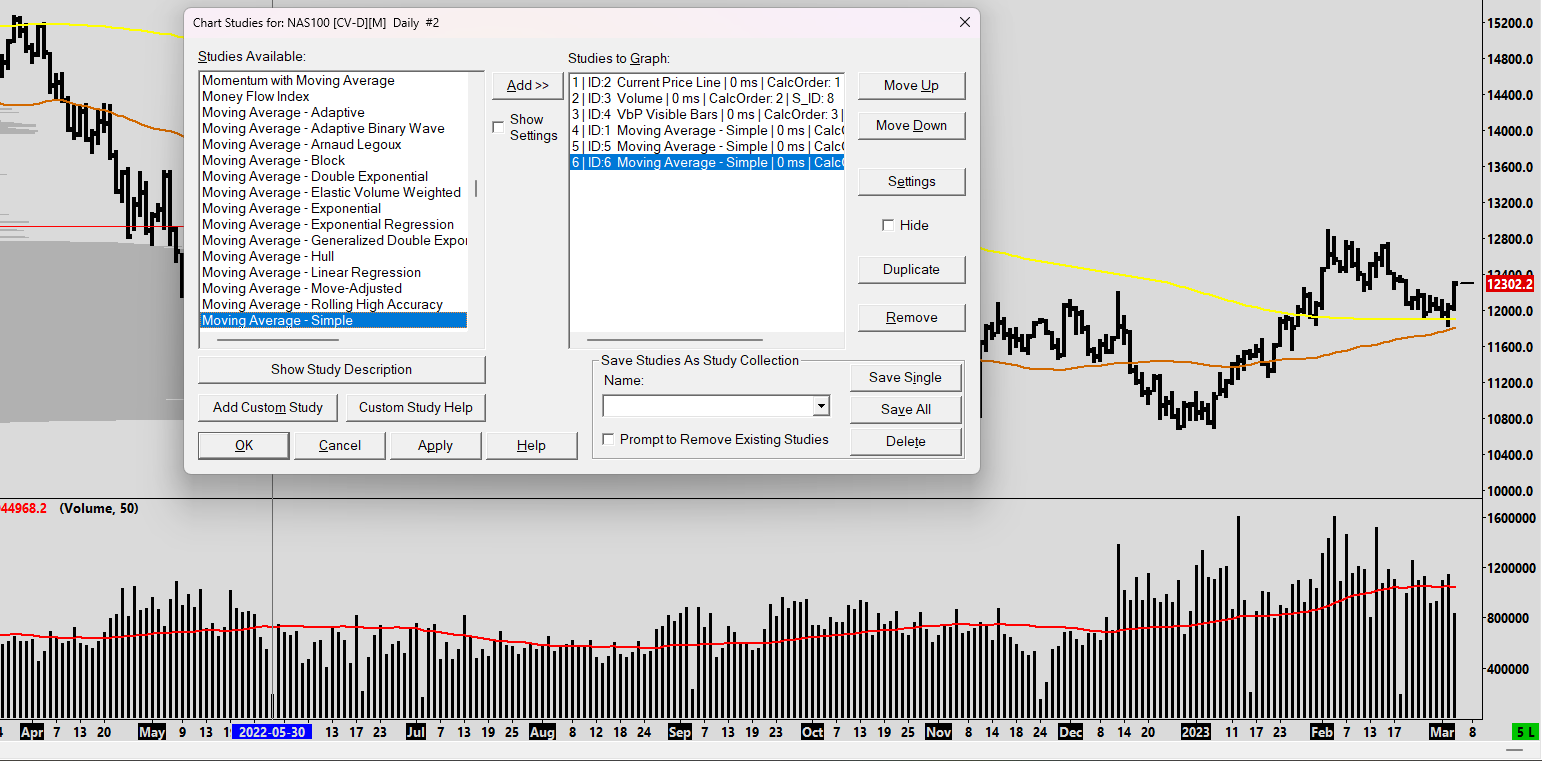 In each screenshot the 50 day MA for volume is selected and changes depending on where the study is located in the list. If the MA-Simple study for volume is first or second on the list the 50-day MA average for volume is much higher than if it is 3rd through 6th position on the list. Does the position in the Studies list supposed to change the results? Thanks |