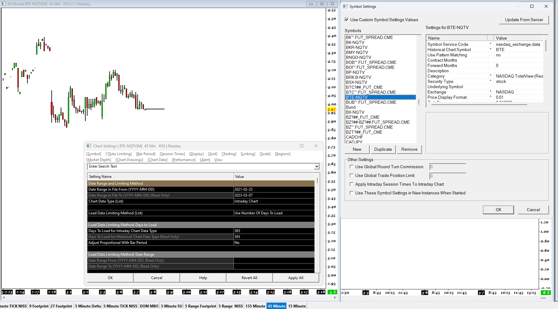Hi John, I set my intraday data using the Data Limiting in the Chart Setting. I doesn't seem to matter what I do, there is only about 20 days loaded. I attached an image showing this on a 45 minute chart with the chart setting and Symbol setting. Kind Regards, |