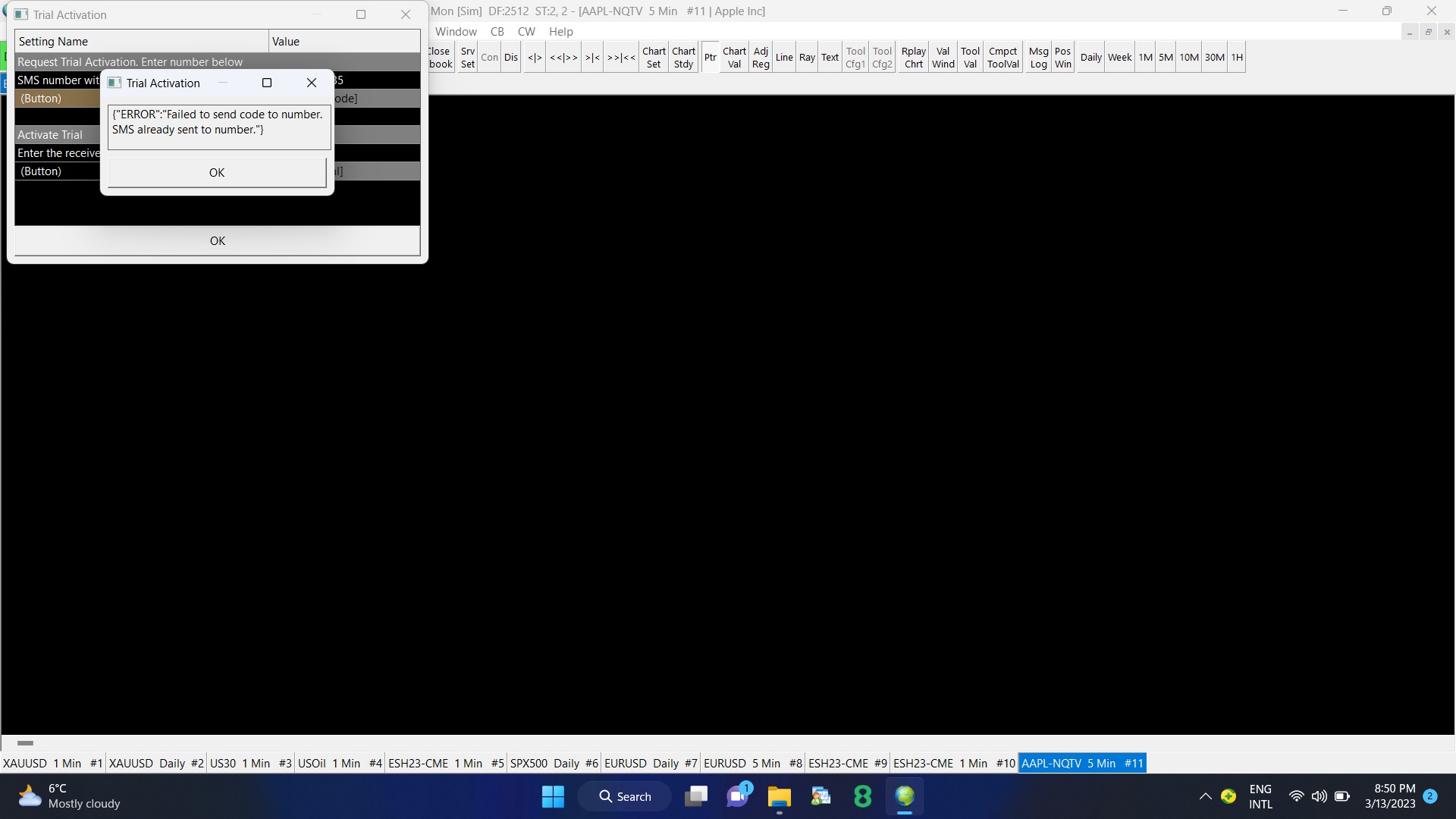 Hello, i have installed sierra chart and tried to activate my trial using sms at no. +359887792735 but i didn't received any sms on this number so i tried again and was getting message that sms is already sent so please check the attached screenshot and please let me know what to do with this issue? |