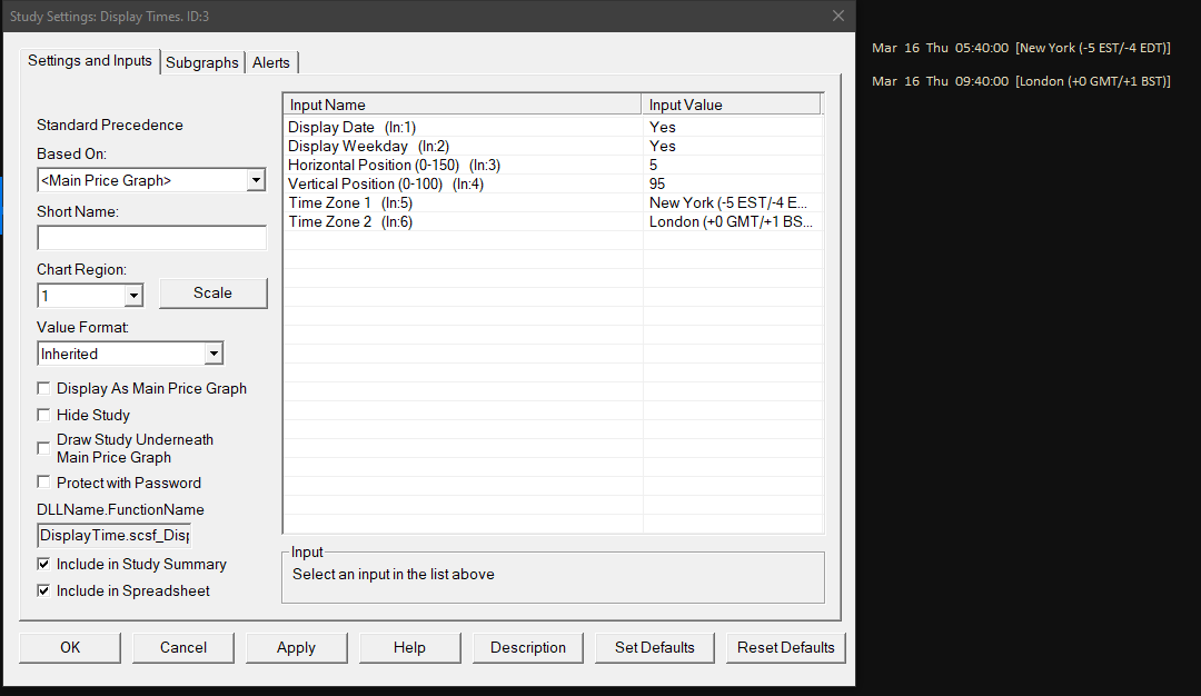Variation on above with selectable time zones. // The top of every source code file must include this line #include "sierrachart.h" // This line is required. Change the text within the quote // marks to what you want to name your group of custom studies. SCDLLName("Display New York and Local Times") //This is the basic framework of a study function. Change the name 'DisplayTimes' to what you require. SCSFExport scsf_DisplayTimes(SCStudyInterfaceRef sc) { auto& DisplayDate = sc.Input[0]; auto& DisplayWeekday = sc.Input[1]; auto& Horizontal = sc.Input[2]; auto& Vertical = sc.Input[3]; auto& TimeZone1 = sc.Input[4]; auto& TimeZone2 = sc.Input[5]; auto& TextSizeColor = sc.Subgraph[0]; if (sc.SetDefaults) { sc.GraphName = "Display Times"; sc.AutoLoop = 0; sc.GraphRegion = 0; TextSizeColor.Name = "Adjust Text Size and Color"; TextSizeColor.DrawStyle = DRAWSTYLE_CUSTOM_TEXT; TextSizeColor.PrimaryColor = RGB(225, 215, 185); TextSizeColor.LineWidth = 10; DisplayDate.Name = "Display Date"; DisplayDate.SetYesNo(0); DisplayWeekday.Name = "Display Weekday"; DisplayWeekday.SetYesNo(0); Horizontal.Name = "Horizontal Position (0-150)"; Horizontal.SetInt(5); Horizontal.SetIntLimits(0, 150); Vertical.Name = "Vertical Position (0-100)"; Vertical.SetInt(80); Vertical.SetIntLimits(0, 100); TimeZone1.Name = "Time Zone 1"; TimeZone1.SetTimeZone(TIMEZONE_NEW_YORK); TimeZone2.Name = "Time Zone 2"; TimeZone2.SetTimeZone(TIMEZONE_LONDON); return; } const auto dT1 = sc.IsReplayRunning() ? sc.ConvertDateTimeFromChartTimeZone(sc.LatestDateTimeForLastBar, TimeZone1.GetTimeZone()) : sc.ConvertDateTimeFromChartTimeZone(sc.CurrentSystemDateTime, TimeZone1.GetTimeZone()); const auto dT2 = sc.IsReplayRunning() ? sc.ConvertDateTimeFromChartTimeZone(sc.LatestDateTimeForLastBar, TimeZone2.GetTimeZone()) : sc.ConvertDateTimeFromChartTimeZone(sc.CurrentSystemDateTime, TimeZone2.GetTimeZone()); auto displayText = SCString{}; if (sc.IsReplayRunning()) displayText.AppendFormat("Chart Is Replaying ... \n\n"); if (DisplayDate.GetYesNo()) displayText.AppendFormat("%s %d ", SHORT_NAME_FOR_MONTH[dT1.GetMonth()], dT1.GetDay()); if (DisplayWeekday.GetYesNo()) displayText.AppendFormat("%s ", SHORT_NAME_FOR_DAY_OF_WEEK[dT1.GetDayOfWeek()]); displayText.Append(sc.DateTimeToString(dT1, FLAG_DT_COMPLETE_TIME)); displayText.AppendFormat(" [%s]\n\n", TIME_ZONE_NAME_STRINGS[TimeZone1.GetTimeZone()]); if (DisplayDate.GetYesNo()) displayText.AppendFormat("%s %d ", SHORT_NAME_FOR_MONTH[dT2.GetMonth()], dT2.GetDay()); if (DisplayWeekday.GetYesNo()) displayText.AppendFormat("%s ", SHORT_NAME_FOR_DAY_OF_WEEK[dT2.GetDayOfWeek()]); displayText.Append(sc.DateTimeToString(dT2, FLAG_DT_COMPLETE_TIME)); displayText.AppendFormat(" [%s]\n\n", TIME_ZONE_NAME_STRINGS[TimeZone2.GetTimeZone()]); sc.AddAndManageSingleTextUserDrawnDrawingForStudy(sc, 0, Horizontal.GetInt(), Vertical.GetInt(), TextSizeColor, 1, displayText, 1, 0, 0); } |