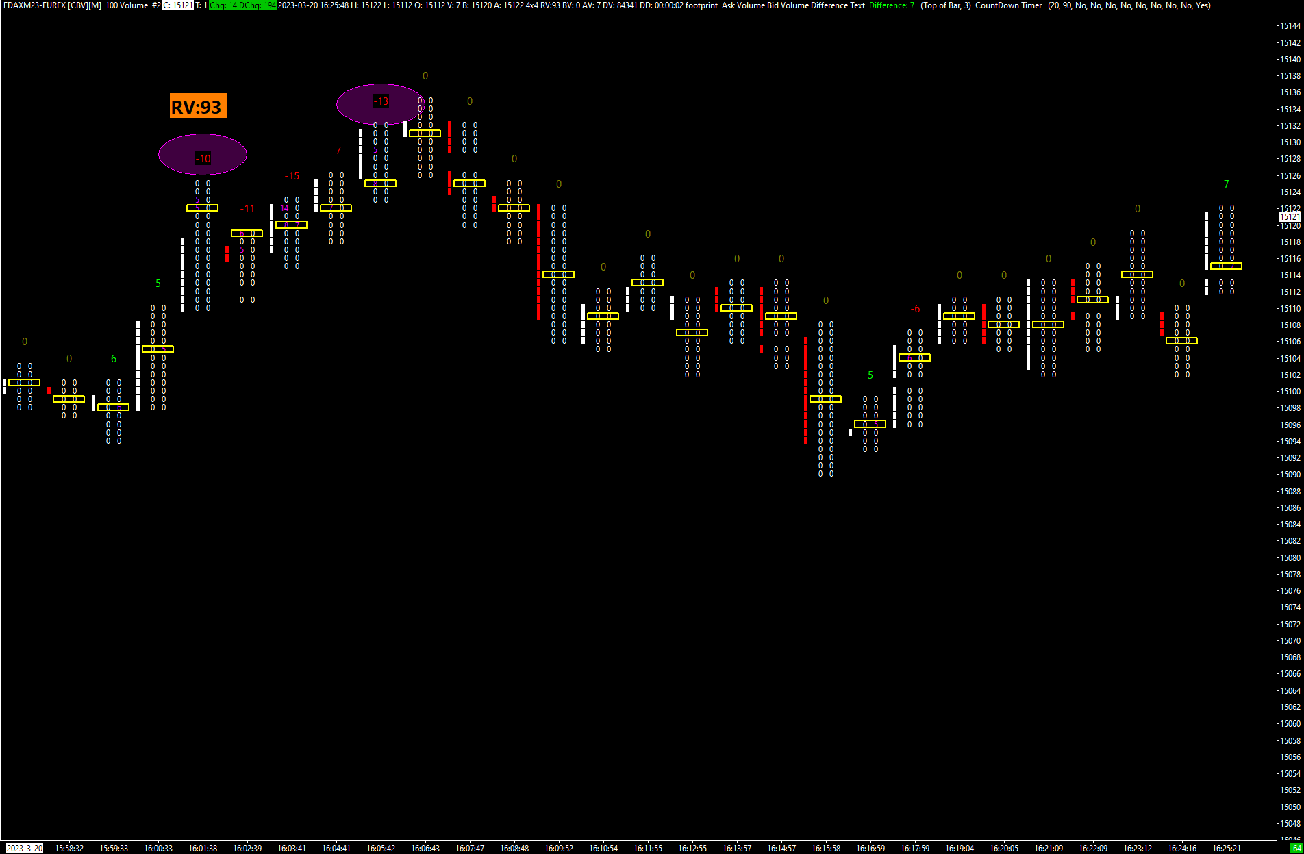 oui je sais que sur le graphique#2 il y a des 0 partout, d'ailleurs je ne le regarde pas. Ce graphique me sert à uniquement à faire apparaitre le nombre de contrats que mets un seul opérateur quand c'est supérieur ou égal à 5 https://www.sierrachart.com/image.php?Image=1679325950306.png le -10 et le -13 entourés signifient qu'un opérateur à posé 10 contrats à la vente en 1 fois, et pareil pour le -13. Ensuite je reporte ce numéro sur mon graphique#1 avec l'étude "study price overlay", et normalement cela doit apparaitre sur mon graph# comme sur mon graph#2 ça marche très bien quand je suis en tick reversal, mais en barres de volumes ça ne marche plus, les chiffres apparaissent n'importe ou |