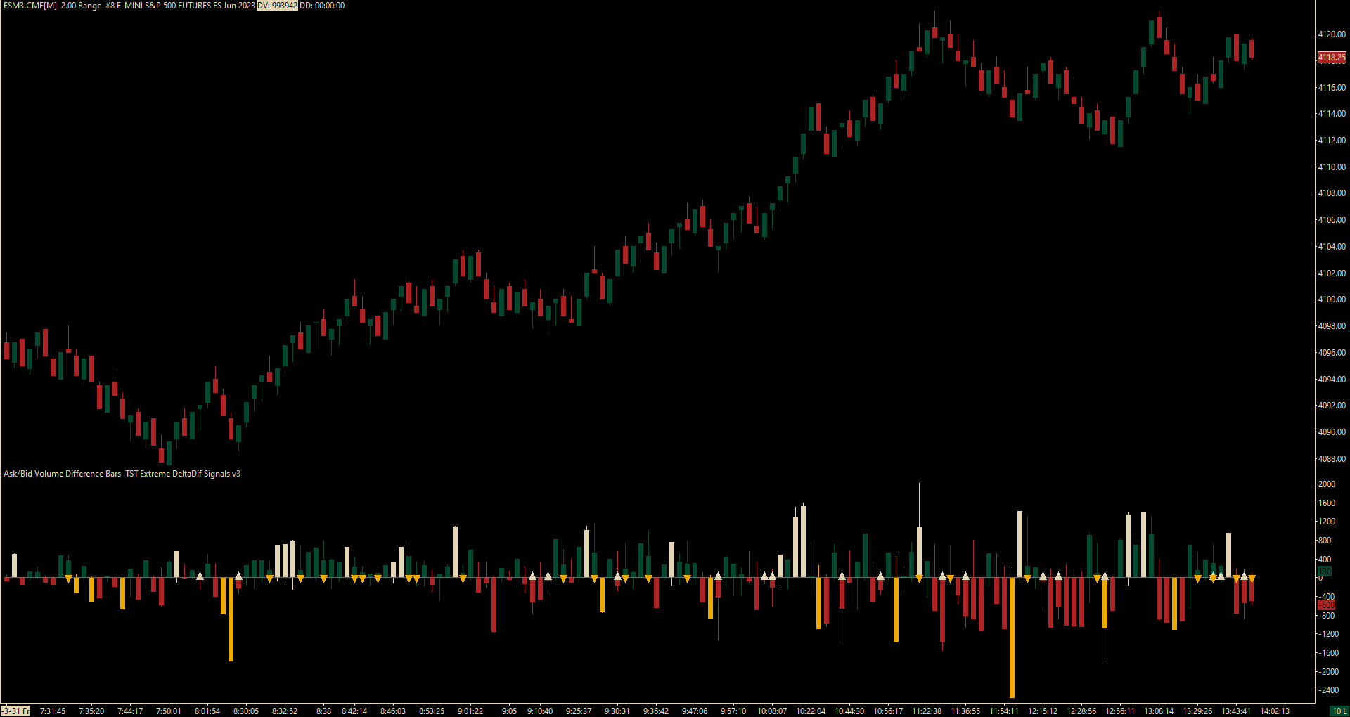 https://www.sierrachart.com/image.php?Image=1680288699272.png// positive delta or the lowest negative delta for a price bar. It compares only a // current positive delta bar to positive delta bars or a current negative delta bar // to negative delta bars. If the current price bar has positive delta // greater than any individual price bar positive delta in the lookback range the // current bar is deemed extreme positive delta. If the current price bar has negative // delta less than any individual price bar negative delta in the lookback range the // current bar is deemed extreme negative delta. Also, if a current price bar is an up bar // with negative delta a negative divergence signal is set. If a current price bar is a // down bar with positive delta a positive divergence signal is set. // This line is required at the top of every source code file. #include "sierrachart.h" // This line is required. The name of the group of custom studies. SCDLLName("TriStar_ExtDeltaDifSignals_v3") // This line is required. The name of the custom study. SCSFExport scsf_ExtDeltaDifSignals_v3(SCStudyInterfaceRef sc) { // Section 1 - Set the configuration variables and defaults. SCSubgraphRef PosDeltaExtreme = sc.Subgraph[0]; SCSubgraphRef NegDeltaExtreme = sc.Subgraph[1]; SCSubgraphRef ZeroLine = sc.Subgraph[2]; SCSubgraphRef BullDivergence = sc.Subgraph[3]; SCSubgraphRef BearDivergence = sc.Subgraph[4]; SCSubgraphRef PosDeltaArray = sc.Subgraph[5]; SCSubgraphRef NegDeltaArray = sc.Subgraph[6]; SCInputRef LookbackNumBars = sc.Input[0]; if (sc.SetDefaults) { // Set the configuration and defaults sc.GraphName = "TST Extreme DeltaDif Signals v3"; sc.AutoLoop = 0; sc.GraphRegion = 1; // Not Main Region sc.GlobalDisplayStudySubgraphsNameAndValue = 0; sc.DisplayStudyInputValues = 0; sc.ValueFormat = 0; // Define the Subgraphs PosDeltaExtreme.Name = "Positive Delta Extreme"; PosDeltaExtreme.DrawStyle = DRAWSTYLE_COLORBAR; PosDeltaExtreme.PrimaryColor = RGB(226,214,181); // MN Wild Wheat NegDeltaExtreme.Name = "Negative Delta Extreme"; NegDeltaExtreme.DrawStyle = DRAWSTYLE_COLORBAR; NegDeltaExtreme.PrimaryColor = RGB(237,170,0); // MN Wild Gold ZeroLine.Name = "Zero Line"; ZeroLine.DrawStyle = DRAWSTYLE_LINE; ZeroLine.LineStyle = LINESTYLE_SOLID; ZeroLine.LineWidth = 1; ZeroLine.PrimaryColor = COLOR_DIMGRAY; ZeroLine.DrawZeros = true; BullDivergence.Name = "Bull Divergence"; BullDivergence.DrawStyle = DRAWSTYLE_TRIANGLE_UP; BullDivergence.LineWidth = 5; BullDivergence.PrimaryColor = RGB(226,214,181); // MN Wild Wheat BearDivergence.Name = "Bear Divergence"; BearDivergence.DrawStyle = DRAWSTYLE_TRIANGLE_DOWN; BearDivergence.LineWidth = 5; BearDivergence.PrimaryColor = RGB(237,170,0); // MN Wild Gold PosDeltaArray.DrawStyle = DRAWSTYLE_IGNORE; NegDeltaArray.DrawStyle = DRAWSTYLE_IGNORE; // Define the inputs LookbackNumBars.Name = "Number of Lookback Bars"; LookbackNumBars.SetInt(5); LookbackNumBars.SetIntLimits(1, INT_MAX); return; } // manual looping example for (auto index = sc.UpdateStartIndex; index < sc.ArraySize; index++) { // Init required variables int CurrentBarDeltaDif = sc.AskVolume[index] - sc.BidVolume[index]; // Capture the current price bar delta auto i = index-1; // Set the index one bar back to ignore the current bar auto countPos{ 0 }; // Set the while loop position counter to zero // start at current index and decrement index value // until when we have reached 5 pos delta bars // or until index 0 is reached while (i > 0 && countPos < LookbackNumBars.GetInt()) { // Populate the pos/neg delta arrays depending on pos/neg delta of current bar if (CurrentBarDeltaDif > 0 && // Current bar positive delta sc.AskVolume[i] > sc.BidVolume[i]) // Add to array if bar at i is delta positive { PosDeltaArray[countPos] = sc.AskVolume[i] - sc.BidVolume[i]; // Populate the positive array at i countPos++; // Increment the array position counter } else if (CurrentBarDeltaDif < 0 && // Current bar negative delta sc.AskVolume[i] < sc.BidVolume[i]) // Add to array if bar at i is delta negative { NegDeltaArray[countPos] = sc.AskVolume[i] - sc.BidVolume[i]; // Populate the negative array at i countPos++; // Increment the array position counter } i--; // Decrement the while loop index counter } // Init required variables int n = LookbackNumBars.GetInt(); // Get the size of the pos/neg delta array int PosDeltaArrayMax = 0; // Init the positive delta array max variable int NegDeltaArrayMin = 0; // Init the negative delta array min variable // Loop through the delta arrays to get either the max positive bar delta or min negative bar delta for (int pos = 0; pos < n; pos++) { if (CurrentBarDeltaDif > 0 && // Current bar delta GT zero PosDeltaArray[pos] > PosDeltaArrayMax) // Check bar[pos] to see if GT current max delta PosDeltaArrayMax = PosDeltaArray[pos]; // If GT current max delta assign new max delta else if (CurrentBarDeltaDif < 0 && // Current bar delta LT zero NegDeltaArray[pos] < NegDeltaArrayMin) // Check bar[pos] to see if LT current min delta NegDeltaArrayMin = NegDeltaArray[pos]; // If LT current min delta assign new min delta } // Compare the current price bar delta to either the max or min delta array to determine if extreme or not if (CurrentBarDeltaDif > 0) // Current bar has positive delta { if (CurrentBarDeltaDif > PosDeltaArrayMax) // Current bar positive delta is GT max bar delta in lookback range PosDeltaExtreme[index] = 1; // Paint the extreme positive delta signal else // Current bar positive delta is LT/EQ max bar delta in lookback range PosDeltaExtreme[index] = 0; // DO NOT paint the extreme positive delta signal } else if (CurrentBarDeltaDif < 0) // Current bar has negative delta { if (CurrentBarDeltaDif < NegDeltaArrayMin) // Current bar negative delta is LT min bar delta in lookback range NegDeltaExtreme[index] = 1; // Paint the extreme negative delta signal else // Current bar negative delta is GT/EQ min bar delta in lookback range NegDeltaExtreme[index] = 0; // DO NOT paint the extreme negative