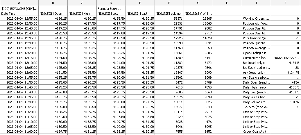 I'm working with a spreadsheet, but it is now sorted in reverse order of time. Row 3 begins with the last bar of the day rather than the first. If I try and sort, it sorts the that column, EXCEPT row 3 still begins with the last bar of the day, and the rest of the data is sorted with it like the "expand selection" feature in excel. I've tried removing the study and starting again, but the same thing happens every time. |