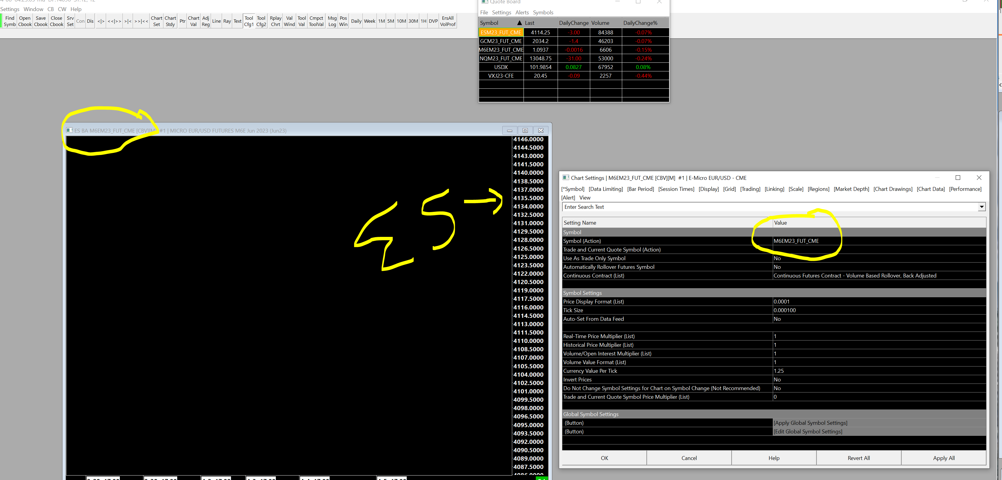 John, I am thinking they classify the 'big' 6E contract as something different than a big ES or NQ? So the fuckers will want more money in fees? I can clearly get the micro 6E... Now, this is very weird. I took an ES market profile chart. I changed the symbol to micro 6e(I can get simple 1 min or 60min micro 6E charts) But look at what I get. I have changed the symbol as you can see, and the title in the chart has changed, but nooooooo I have the ES price graph there...help please. and how much do those bastards at CME want for access to the big contract data? Thanks Karen |