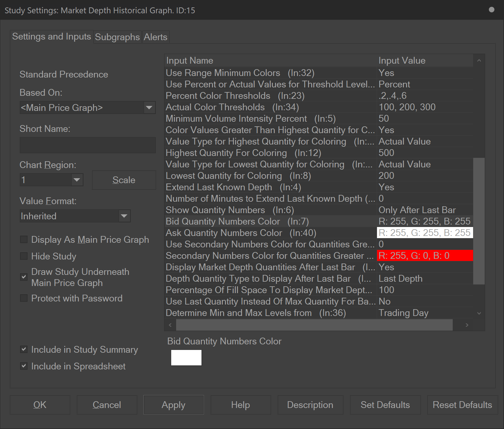 I have a chart with the Market Depth Historical Graph study. Orders in the limit book are not represented correctly in the historical graph. Two examples from the screenshot: - 4134.75 has 132 contracts on the bid but the study shows 486 - 4142.00 has 405 contracts on the offer but the study shows 225 Depth Quantity Type to Display After Last Bar is set to Last Depth. Maximum Levels to Display is set to 0 for all. |