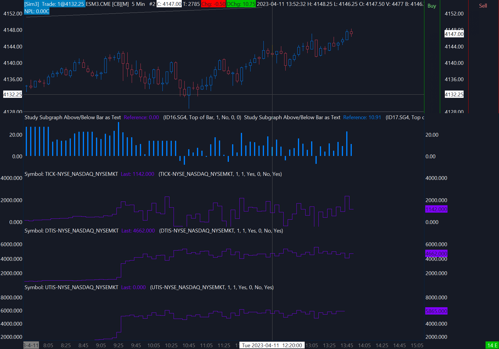 They are the same values, verified by the both the Tool Values Window and zooming into the tick panel to the hundredth decimal precision (https://www.sierrachart.com/image.php?Image=1681234486128.png). The internals don't match the price action. I've been looking at the SPY almost exclusively every day for about a year. Something is wrong. I've also included an image showing the underlying values for the tick calculation. Those underlying values don't match the graphed calculation (see https://www.sierrachart.com/image.php?Image=1681235555805.png) |