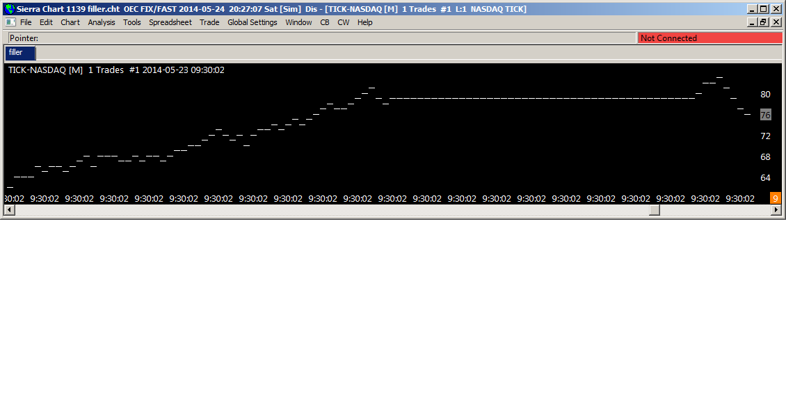 1. First, a quibble about the statement in the documentation. TICK-NASDAQ, when being charted live, often is updated more than twice a second. For example in the attached file (TICK-NASDAQ-1.png) you can see that it was updated more than 100 times at 9:30:02 on 2014-05-23. Of course, the opening is an extreme case. But very often during the day the O, H, L and C of a 1 second bar are different values, indicating that the instrument must have been updated more than twice (see TICK-NASDAQ-2.png). Would it not be useful (and correct) to have the actual algorithm for live updating be described in the documentation? 2. Given that SC has collected live data with millisecond timestamps that occur more than twice per second; and given that all these distinct ticks appear on a chart, even after the chart book (or even SC) is closed and reopened, it seems inconsistent for the "Export Intraday Data to Text file" function to write out the data as 1 second O, H, L, C bars, as it seems to do for me. If this function will not be changed, will all the requisite information be available in ACSIL so that I may write my own export function that accurately shows all the different tick values that were captured in a particular second? |