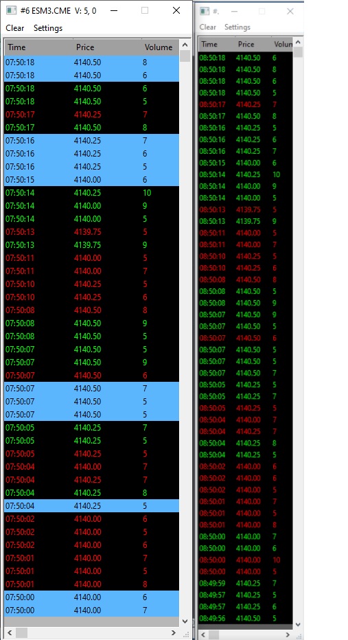 Wanted to post a screen shot of what I am talking about. My time and sales is on the left, his is on the right. As you can see, my above ask highlight is going off constantly while his is not highlighting at all. And again, this is only for the above ask. The below bid matches up perfectly.