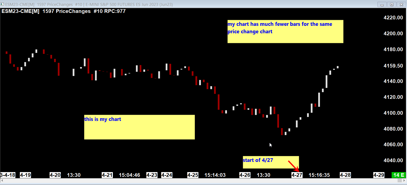 Hi, My friend also uses sierra and forward me the template he has. I loaded the template as well as the same type of chart - he was using a 1597 price changes chart. For some reason which we can't understand, he has more than double the number of bars that I have on my chart. We both use the same denali /teton feed. Could you help identify why there is such a bug difference please ? Let me know if you ned more information. Please see attached images. Thanks so much! |