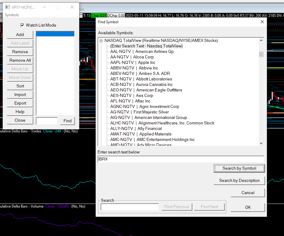 When I search for a specific stock "IBRX" in my example under "NASDAQ TotalView (Realtime NASDAQ/NYSE/AMEX Stocks) there are no results showing.