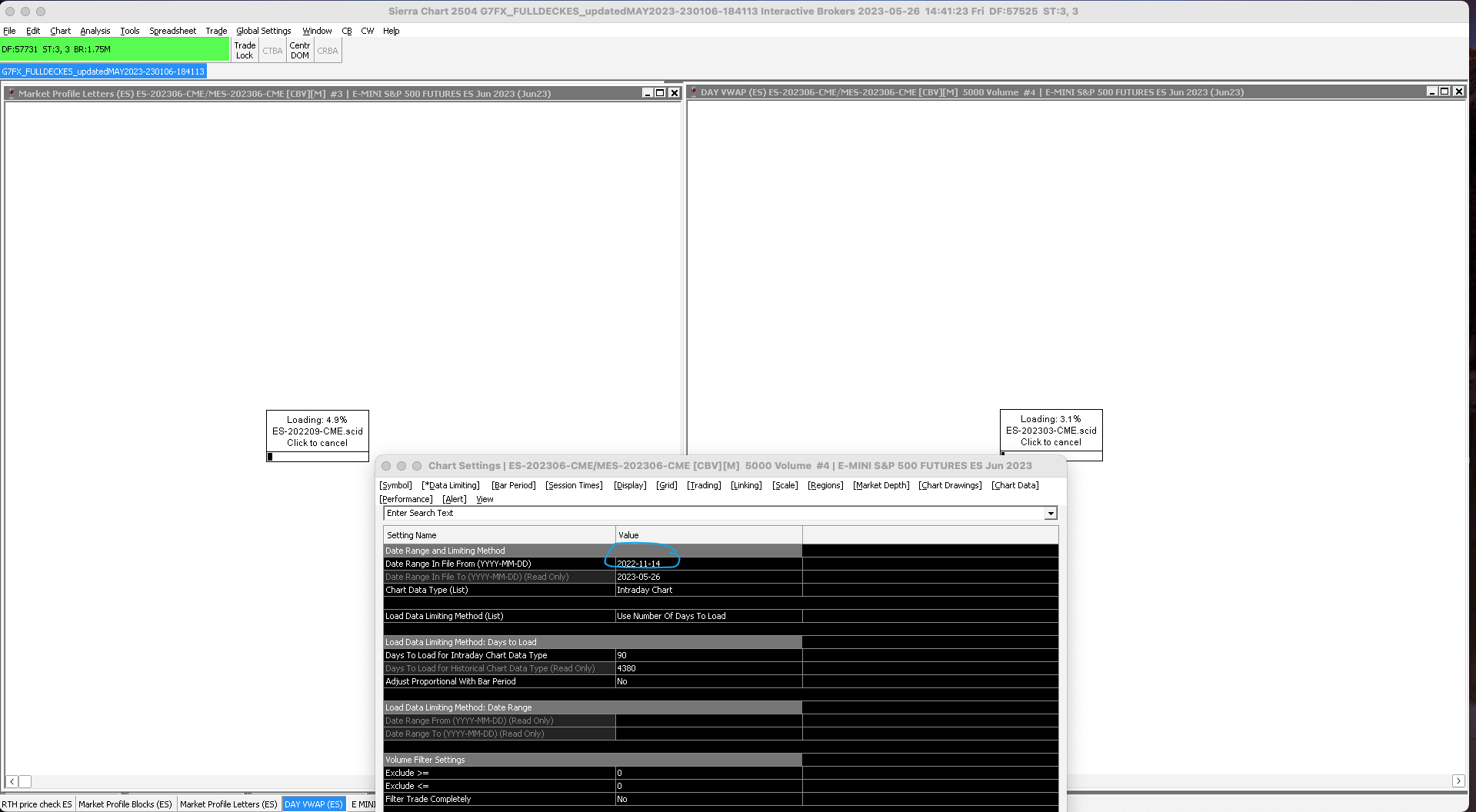 So i went to chart - chart setting - data limiting and each time I try to change the Date Range in File it to 2023-01-30 and hit apply to all it goes back to the date I have circle in the attachment. I reduced the Days to load to 90 from 365 and it's been over 5 hours since trying to download the historical data. I have Danali Data feed.