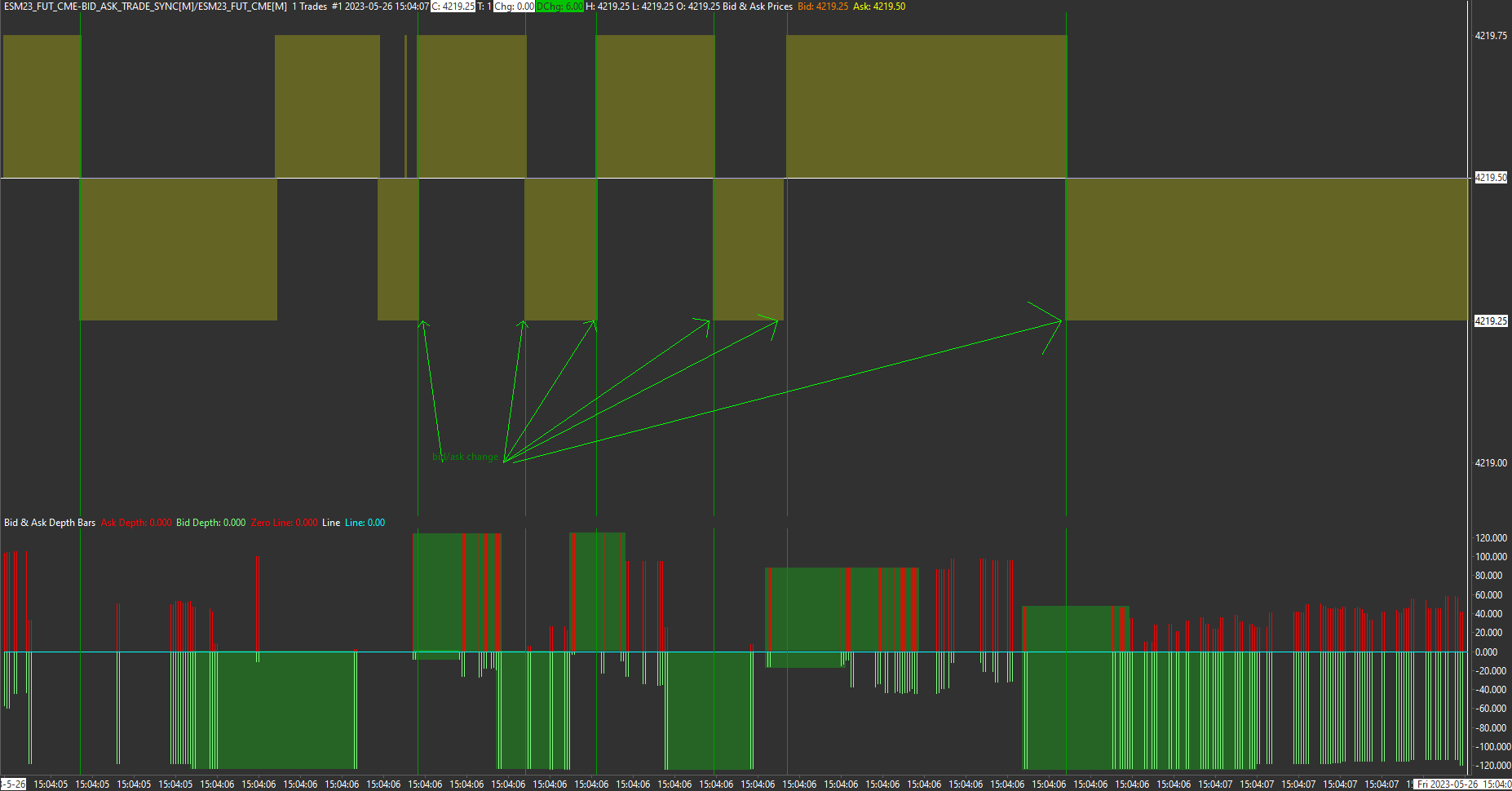 Here is a screenshot of what I'm referring to. I followed the instructions explicitly for setting up a 1 tick data recording mode chart (-BID_ASK_TRADE_SYNC). This example is on ES. The green arrows point to the moment where the bid/ask price changes (as do the vertical lines to show comparison to when the bid and ask depth values change). The green rectangles over the bid and ask bars subgraph show times when the last updated bid/ask depth values are equivalent to the following bid/ask depth values AFTER there was a bid/ask price change. This is for best bid offer, but I have double checked this on a non-filtered market depth setting and the results are the same. There are 8 occurrences of this in less than 1 second. Hard to imagine that this is just a coincidence in the book. When trying to build a system or do analysis, this greatly skews the results and I'm not exactly sure how a custom study could fix the data not lining up correctly. https://www.sierrachart.com/image.php?Image=168521615276.png |