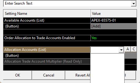 I have several accounts that I'm trying to use the Order Allocation function on. In the Trade Window, I choose one account named APEX-65575-01 (see Clipboard01.jpg) then I click on M/Menu -> Settings -> Order Allocation to Trade Acccounts (see Clipboard02.jpg). I'm trying to allocate across 3 of my accounts (APEX-65575-01, APEX-65575-02, and APEX-65575-03). I fill in APEX-65575-01 in the "Available Accounts (List)" field. I believe the "Allocation Accounts (List)" field should contain the populated drop-down menu list of my accounts APEX-65575-01, APEX-65575-02, and APEX-65575-03. But, the populated drop-down menu list is empty (see Clipboard03.jpg). Did I follow the SC instructions correctly?