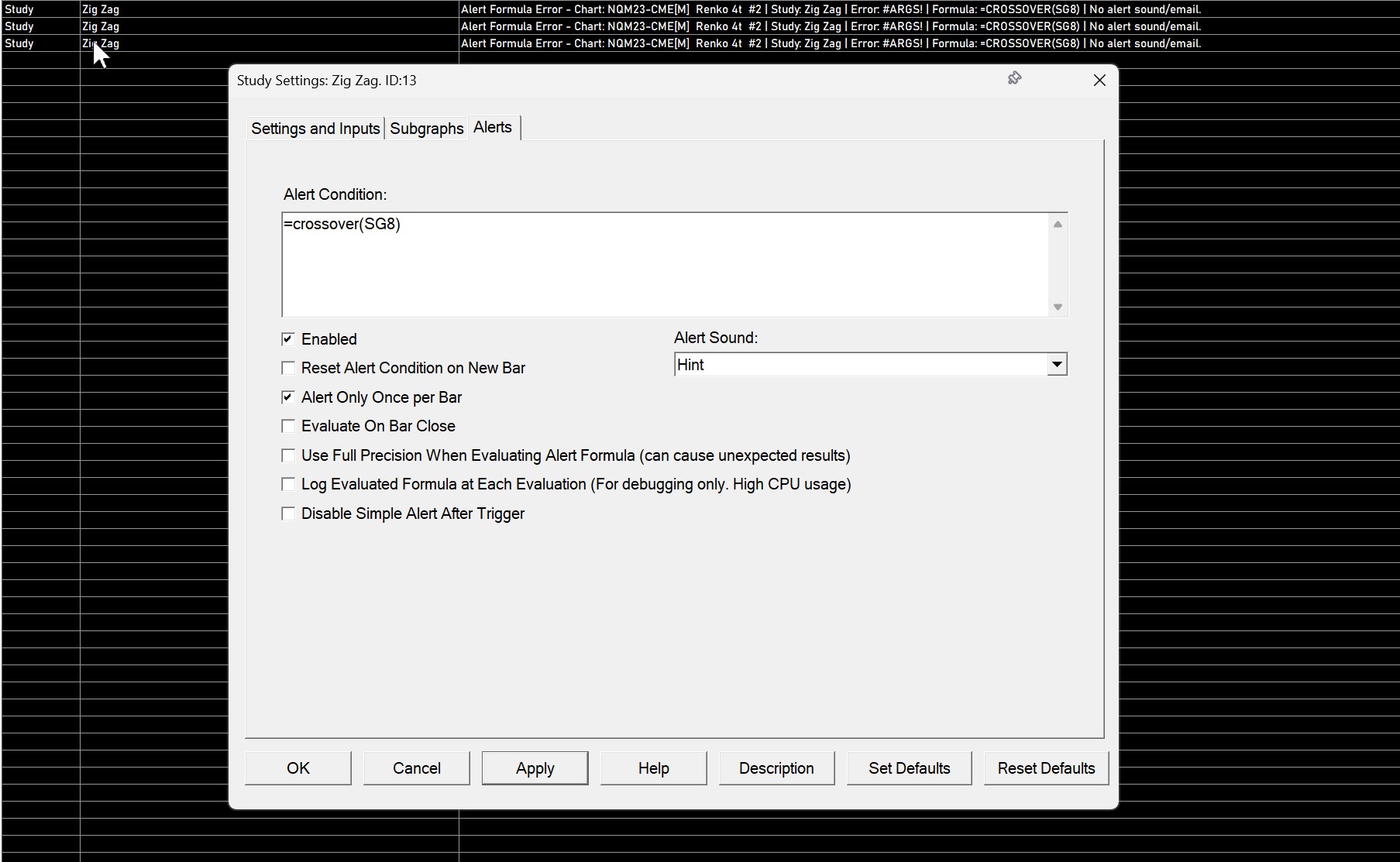 Hello I have a problem with the alarm setting. I use the Zig Zag Study and display the extension lines. Now I want an alarm sound to come when this line is touched. I have written the text =crossover(SG8) in the alarm window of the Zig Zag Study. (SG8 is the extension line) There is no alarm but an error message in the alarmlog, see picture. The sound file is ok the sound alarm works with other indicators. The syntax also works, e.g. with VWAP Study. What am I doing wrong? Thanks |