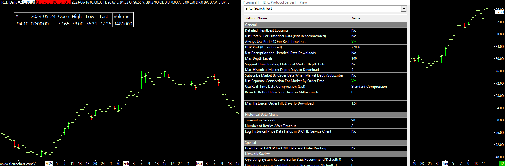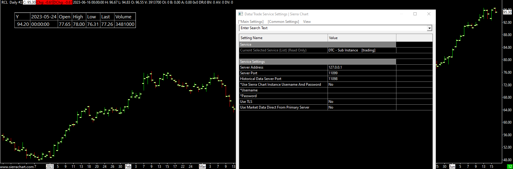 Hello: I am trying to use delayed historical data in another instance of Sierra chart. I am unable to navigate to "SC Data - All Services". I have attached screenshots of the data/trade service settings as well as Sierra chart server settings. I am not sure what setting is not correct. Thanks for any help received. https://www.sierrachart.com/image.php?Image=1687004728240.png https://www.sierrachart.com/image.php?Image=168700476772.png https://www.sierrachart.com/image.php?Image=1687004832203.png https://www.sierrachart.com/image.php?Image=1687004850706.png |