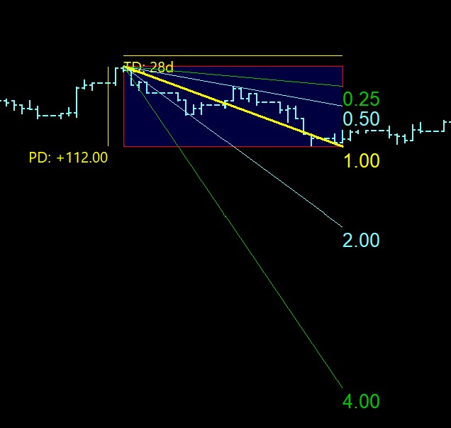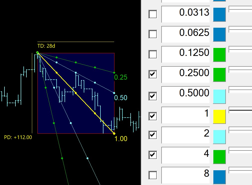 The easiest way I have found to do this is to use the Gann Fan tool. First calculate a valid 1x1 line, your 45° angle. You can manually scale your chart if you want the square to look like a square, but I found this to be a pain and thankfully it is not necessary. With the Gann Fan tool, once you set the angle you can drag it around wherever you want and the scale will change with the chart scale because the anchors are set from the base to the future point that measures 45°. So just find two points that you know on a properly scaled paper chart would be 45° (like 1 day for 1 point or whatever) and anchor your fan with them. Then add your ratios via percentage equivalents and you will have your fan. If you really want it "square" you can then adjust the price scale to narrow or widen it visually. In the attached pics I have a square of 28 drawn with the rectangle tool (28 days by 112 points in this case) and then added the Gann Fan on top. The first one is scaled to look like a square and the second with the scale narrowed to show how the fan will adjust properly to still give the correct ratios. All you need are the points at the start of the square and the 1x1 through the other corner. I have the "Copy and Move" and "Flip Vertical" items added to my drawing tool right click menu to quickly create a new one and flip it from high to low. |