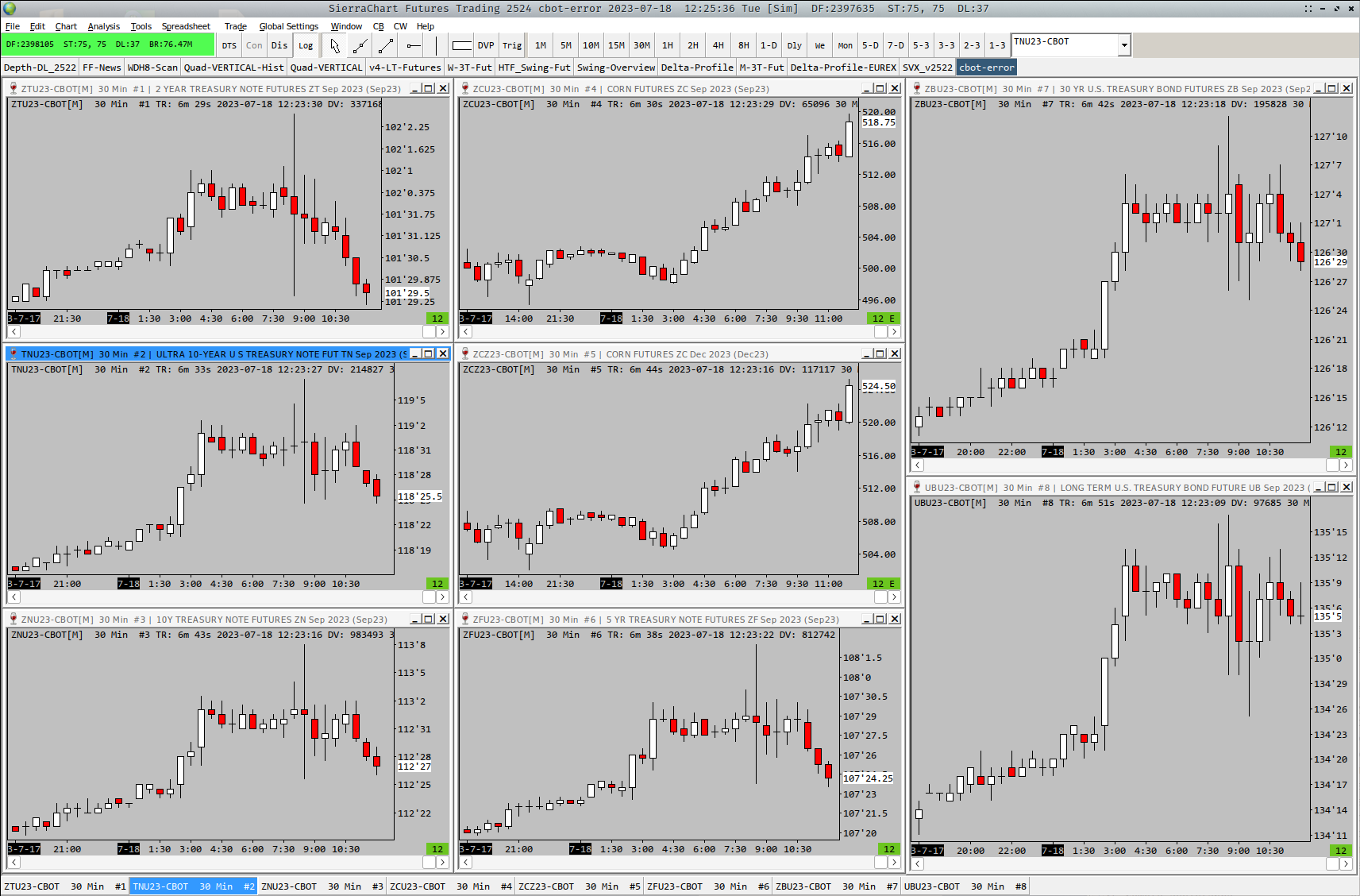 Dear Support Today I am experiencing the following problem continually: Seemingly all of the CME group symbols stopped streaming in realtime and they seem frozen. Also in the message log, the following message (related to various symbols) pops up: ZTU23-CBOT[M] 1 Min #49 | Out of order timestamps detected. Chart tool drawings and some chart studies may not function properly. Prior Date Time: 2023-07-18 10:02:00. Next Bar Date Time: 2023-07-18 10:00:00. Filename: ZTU23-CBOT.scid | 2023-07-18 10:02:21.727 ZNU23-CBOT[M] 1 Min #12 | Out of order timestamps detected. Chart tool drawings and some chart studies may not function properly. Prior Date Time: 2023-07-18 11:34:00. Next Bar Date Time: 2023-07-18 11:32:00. Filename: ZNU23-CBOT.scid | 2023-07-18 11:34:25.995 6EU23-CME[M] 1 Min #50 | Out of order timestamps detected. Chart tool drawings and some chart studies may not function properly. Prior Date Time: 2023-07-18 11:53:00. Next Bar Date Time: 2023-07-18 11:51:00. Filename: 6EU23-CME.scid | 2023-07-18 11:53:41.936 Originally I thought it is related to CBOT symbols only, but now it triggers for 6E (CME) etc as well. I tried to fix this by restarting SC and re-downloading the intraday data for the symbols in question as suggested in your documentation, but it did not help. The chartbooks loaded in my SC instance, are the same ones that I always use, and have not made any changes to them recently. Strangely this happens in one of my instances only and another one that uses a separate real-time denali CME/EUREX on a different computer, does not have this problem. Interestingly, the charts where the out-of-order timestamps are detected, are referring to a chartbook where there are empty 1min charts included, with the chart DOM enabled only. This is a chartbook that I exclusively use to trigger the collection of market-depth data. So there are no studies, etc displayed on these charts. Attaching below an example of how this frozen state of the feed looks like: The chart headers show the timestamp of the last executed trade, and it is seriously behind the actual time (as indicated in the header of the main SC window). Occasionally there are new ticks here and there, but when a new tick happens, the displayed timestamp is still way behind the current time. After ~20 minutes, the charts automatically start to display the 'Waiting to download historical data', then the green message 'the data download is complete' appears, but nothing happens. The feed stays similarly frozen. I am using the latest 2524 version. Can you please advise, how to fix this issue? Are you aware of anything like this on your side? Thank you in advance. |
