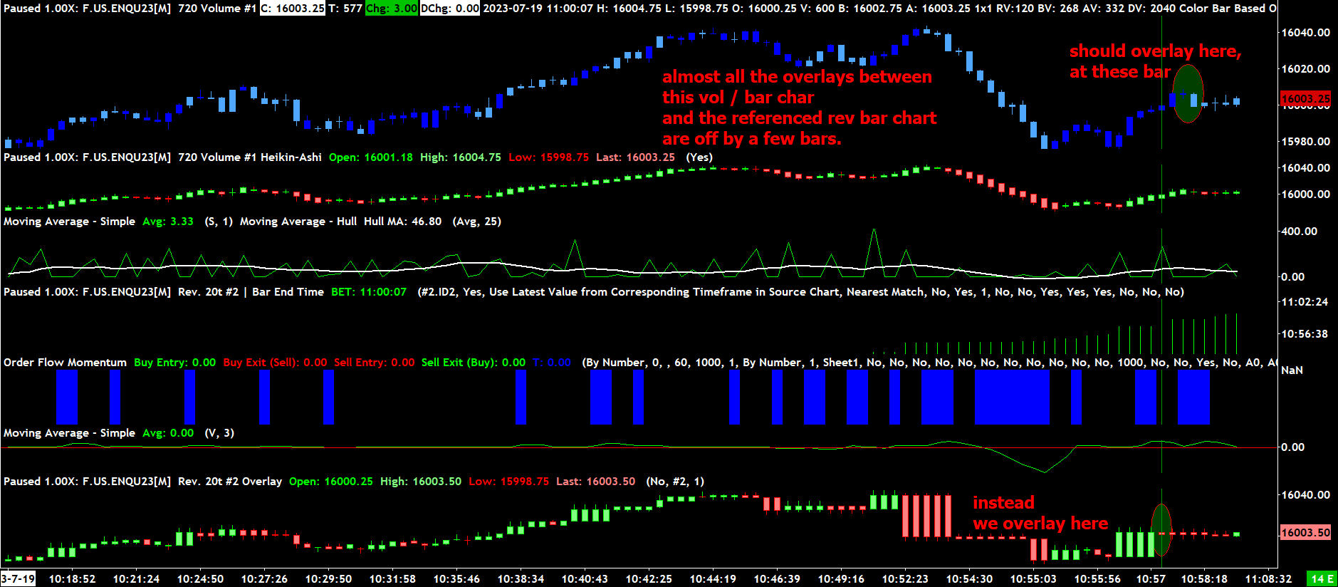 Hey Sierra, I am trying to load and count the number of bars (in a volume per bar chart), which happen during a reversal tick chart bar. Inside a single reversal bar, I might have multiple volume bars (inside the timeframe of a single reversal bar). Sometimes I might have 1 or less. However, the Price overlay does not appear to be using timestamps to overlay the price charts. I have tried using Study price overlay, and Overlay studies. I like the idea I am working with, maybe it could be a momentum type study. I am replicating a study that uses this method. Although, this study requires the overlay to be as close to the timestamp as possible. So I might not be able to use this overlay method. Is there a better way to configure the charts? -LD I've included a snapshot below https://www.sierrachart.com/image.php?Image=1690738971496.png (A new bar on the Reversal Tick chart, begins at 10:57:52. But the Overlay studies mark the reversal at 10:57:17, two bars before it should. Two bars later, there is a new bar at 10:57:45, and three later is 10:57:58). This happens nearly every bar. they don't seem to line up like I thought they should.) |