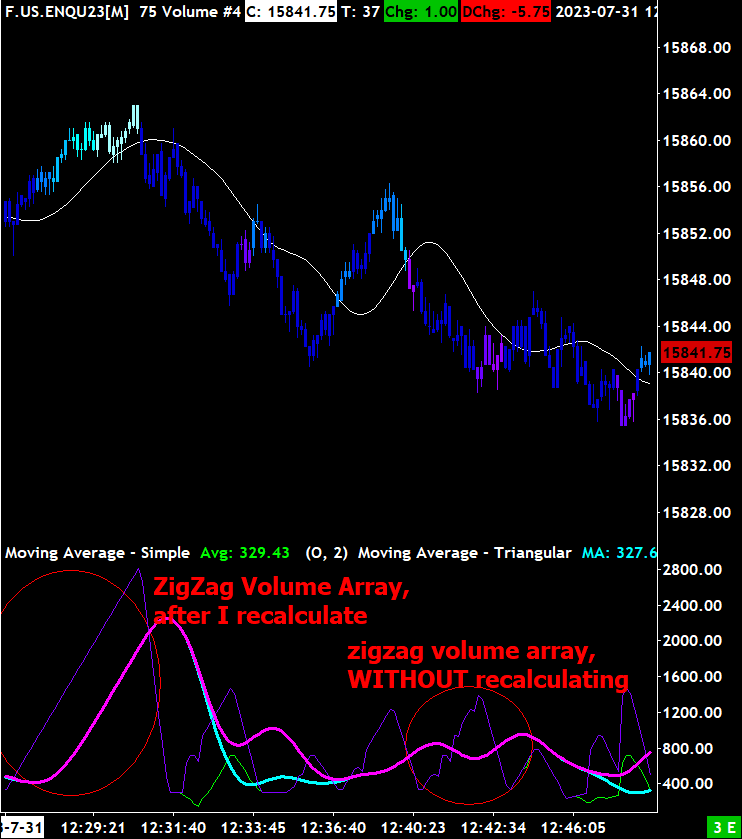 Hey Sierra. I am looking at ZigZag's volume calculation on a volume per bar chart. I am using zigzag in leu of a reversal tick chart. Unfortunately, the zigzag volume calculation / volume array, is continuously stopped (BEFORE the reversal tick is reached). This stopping of the summation of the volume array happens when the price moves down, and then is continued again when the price returns to the trend. Right now, I am using a moving average to track the cumulative volume array. Because the summation of the array stops early, the moving average becomes staggered, and does not fix itself until I refresh / recalculate the chart. I really don't want to recalculate ever time I look at the chart, is there a way to auto recalculate (maybe auto-recalculate the ma?), or to stop the Zigag from ending the summation array before the reversal tick is reached? Before Recalculate https://www.sierrachart.com/image.php?Image=1690822157611.png After Recalculate https://www.sierrachart.com/image.php?Image=1690822233488.png |